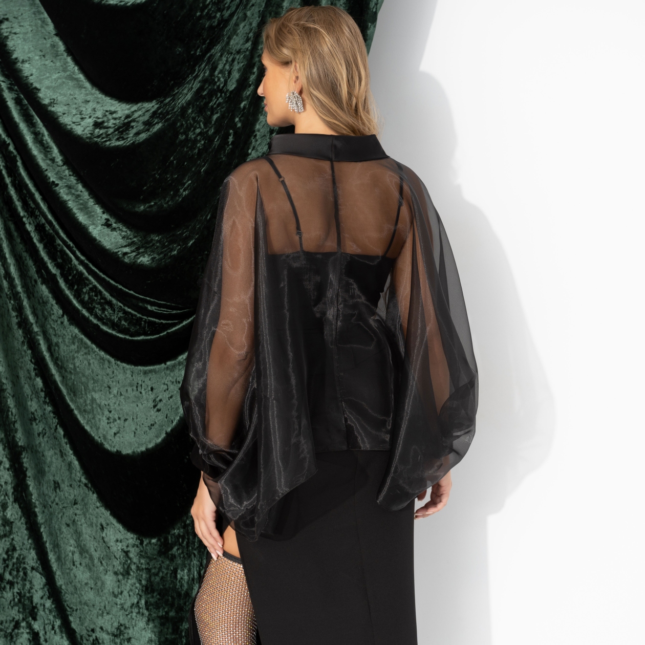 В каждой из нас живёт немного ночи. Органза нежно окутывает плечи, создавая ауру тайны. Свет скользит по ткани, как взгляд, и задерживается дольше...что скрывает эта ночь? Болеро полупрозрачное из органзы с объёмным декором. Отлично сочетается с платьем-комбинацией.