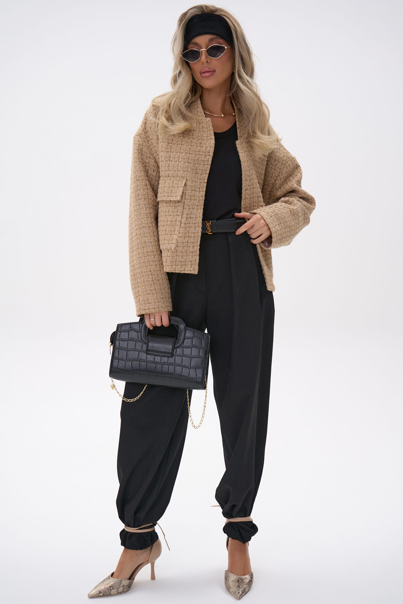 Укороченная длина визуально вытягивает силуэт и подчёркивает линию талии.