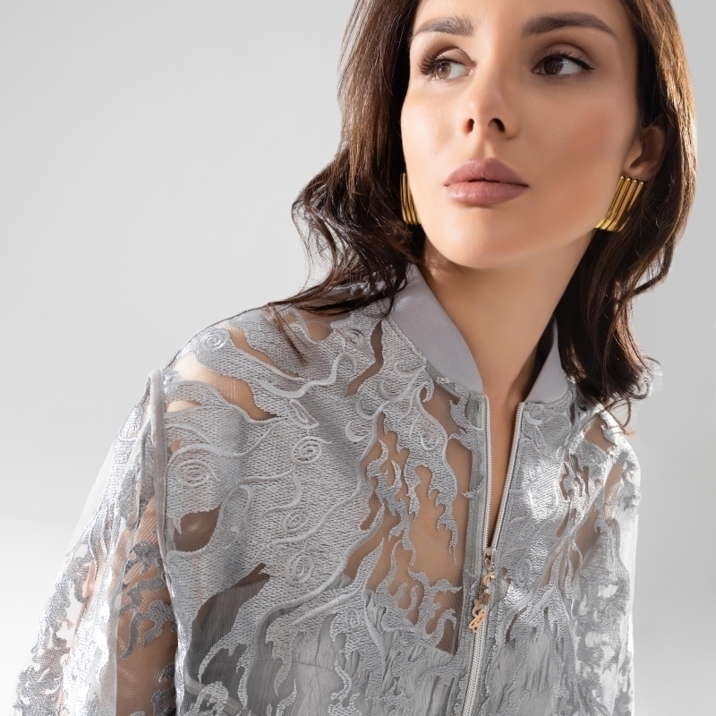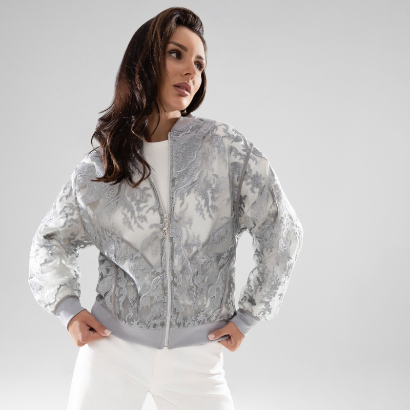 Небанальное решение вопроса второго слоя. Элегантный и женственный бомбер комбинируется как со спортивными образами, так и с максимально женственными. Премиальное кружево, как основной материал, делает бомбер изысканным и привлекающим внимание. Бомбер свободной посадки. Кружево полностью прозрачное. Бомбер на замке, акцентный бегунок на молнии.