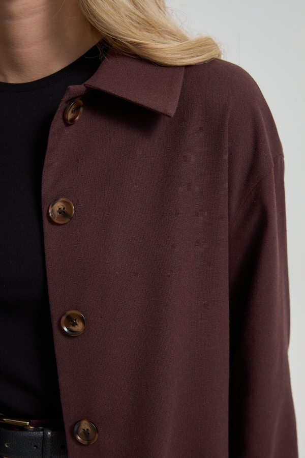 Бомбер из льняного полотна в благородном шоколадном оттенке. Бомбер свободного силуэта со спущенной линией плеча и манжетами на пуговицах и петлях. Воротник отложной, по низу изделия резинка, застёжка на пуговицы и петли.