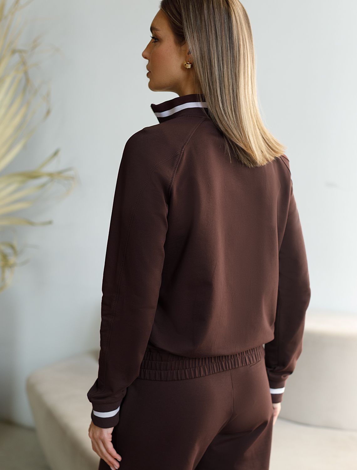 Бомбер коричневого цвета среднего объема с застежкой на молнию выполнен из премиального футера двухнитки плотностью 240 Г/м2. Натуральный состав ткани обеспечивает дышащий эффект, мягкость и приятные тактильные ощущения, Эластичный материал позволяет свободно двигаться без стеснения, а также отлично сохраняет форму даже после длительного ношения. Гладкая лицевая сторона придает бомберу опрятный и дорогой вид. Повседневный бомбер отличается аккуратным силуэтом без лишнего объема и универсальной длиной, которая идеально подходит для повседневного образа. Манжеты на рукавах и широкая резинка по низу обеспечивают надежную посадку, сохраняя тепло в прохладную летнюю погоду. Особенность бомбера - контрастные полосы на горловине и манжетах, которые добавляют современный акцент и делают его более выразительным. Представленная размерная линейка позволяет подобрать оптимальный вариант для любой фигуры и размера, на маленький или плюс сайз, обеспечивая свободу движений без компромиссов по стилю. Этот легкий бомбер станет отличным дополнением к базовому или спортивному гардеробу, сочетая практичность и стиль.