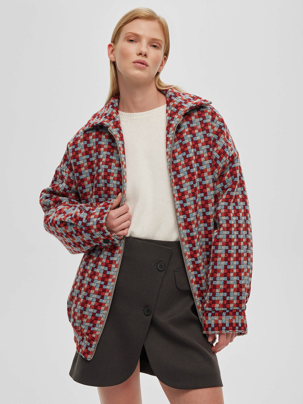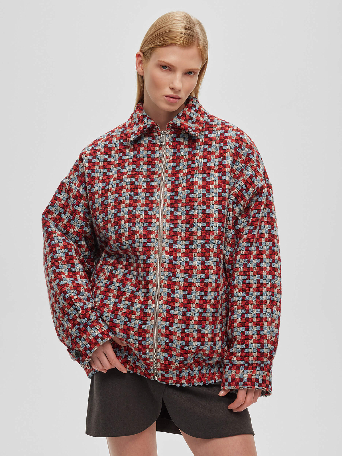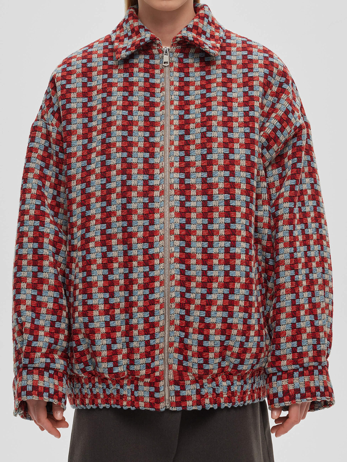 Бомбер утепленный из плетеной ткани 0206, красно-голубой