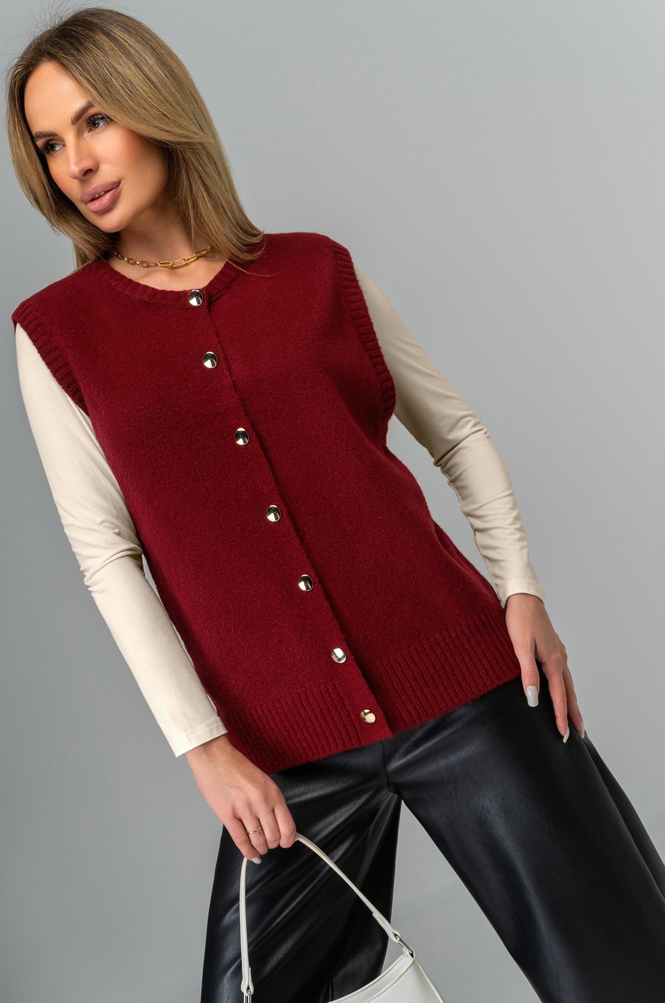 Попробуйте новый уровень элегантности!..показать Представляем стильный акцент демисезонного гардероба – бордовая женская безрукавка! Этот трикотажный жилет создан для тех, кто ценит изящество в каждодневном образе: однотонный вариант с золотистыми пуговицами, привлекающими внимание.