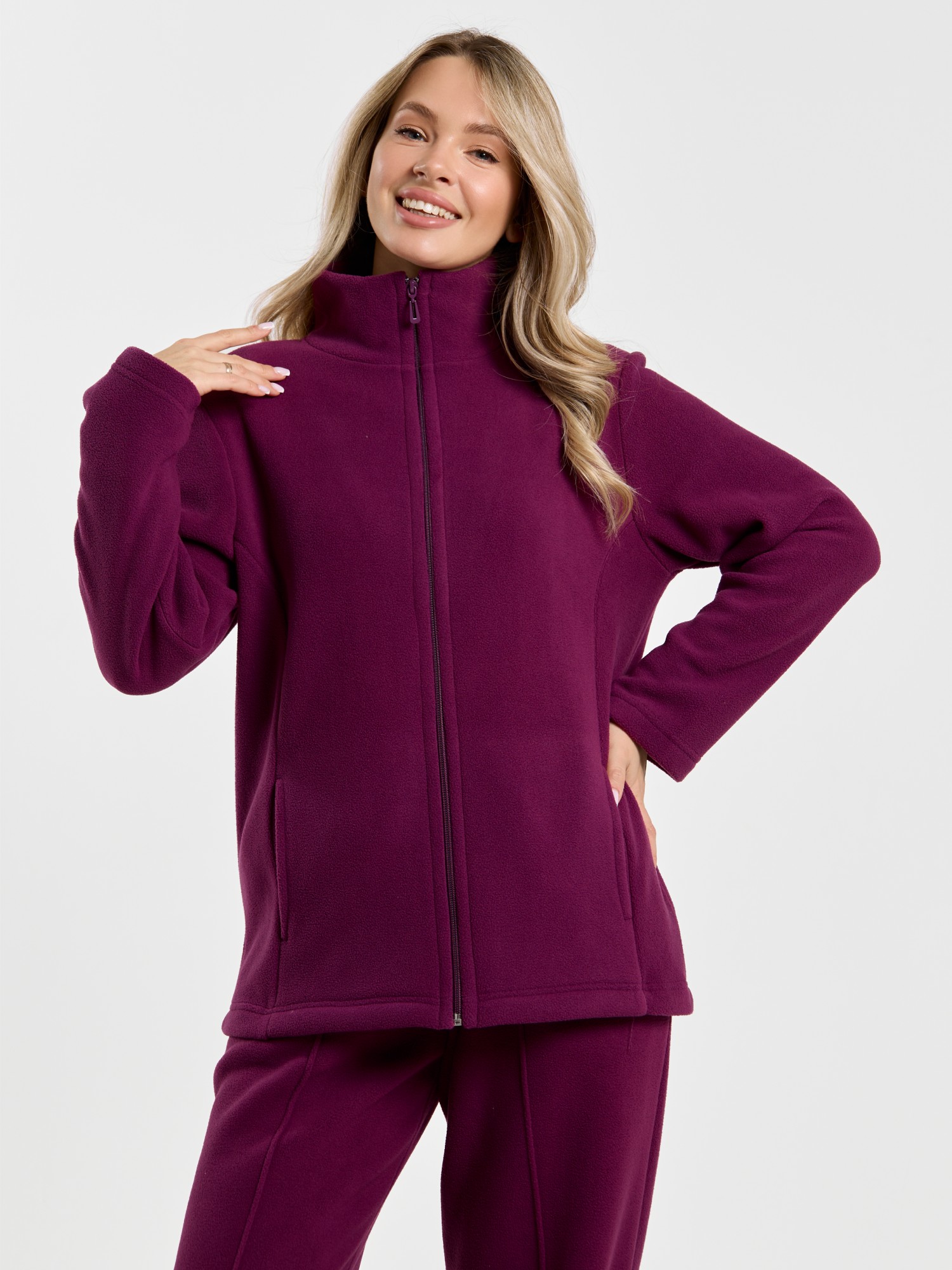 Костюм молодежный из гладкокрашенного трикотажного полотна «флис», Толстовка - полуприлегающего силуэта, с длинными втачными рукавами, воротником «стойка», карманами в рельефных швах, центральной бортовой застежкой на тесьму «молния». Брюки длинные, полуприлегающего силуэта, на притачном поясе с эластичной тесьмой внутри и карманами в боковых швах. Передние половины застрочены поцентральным линиям, низ брюк обработан подгибкой с вложением эластичной тесьмы и регулируется по ширине с помощью фиксаторов.