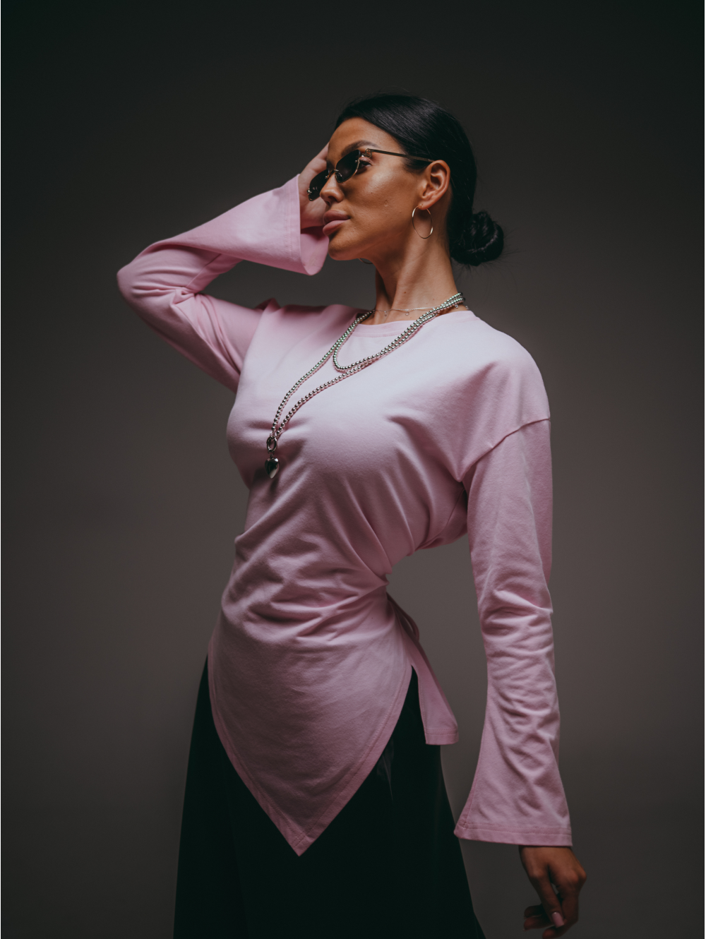 с длинным расклешенным к низу рукавом, низ ассиметричной геометрической формы.