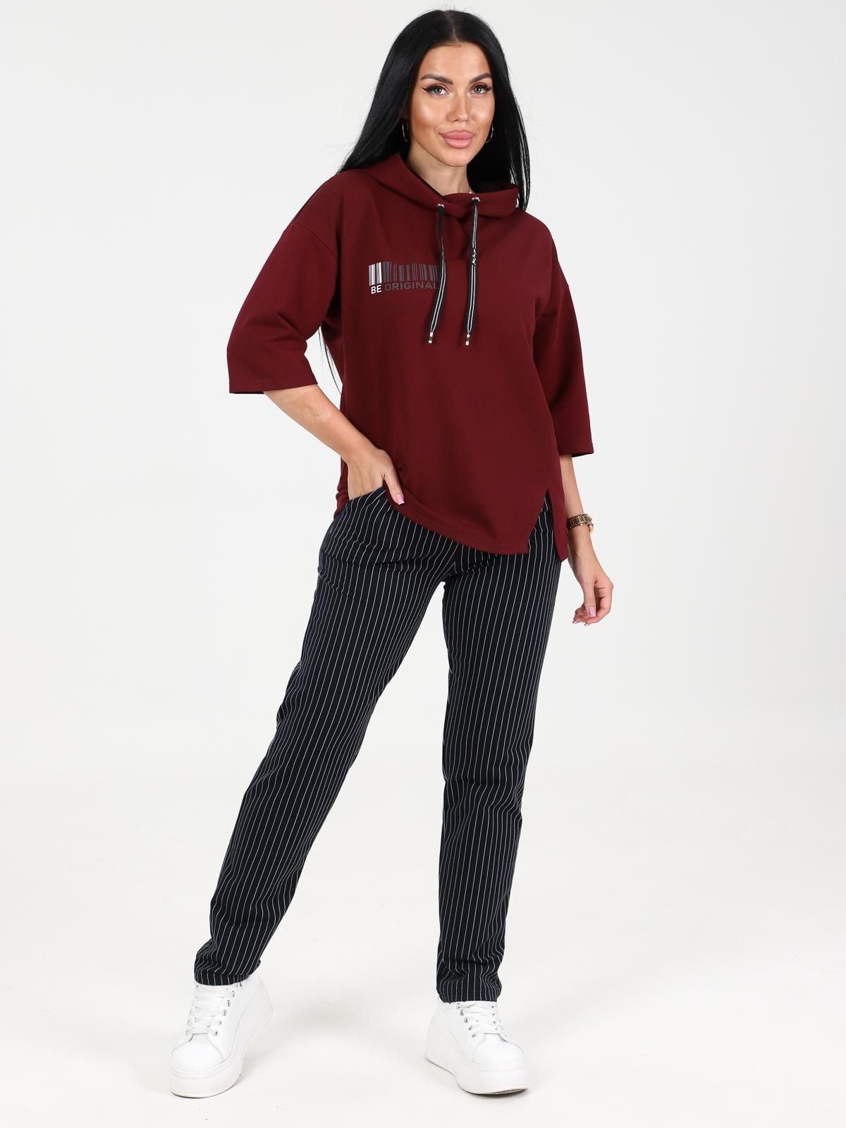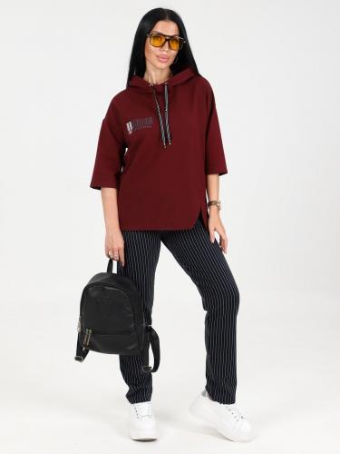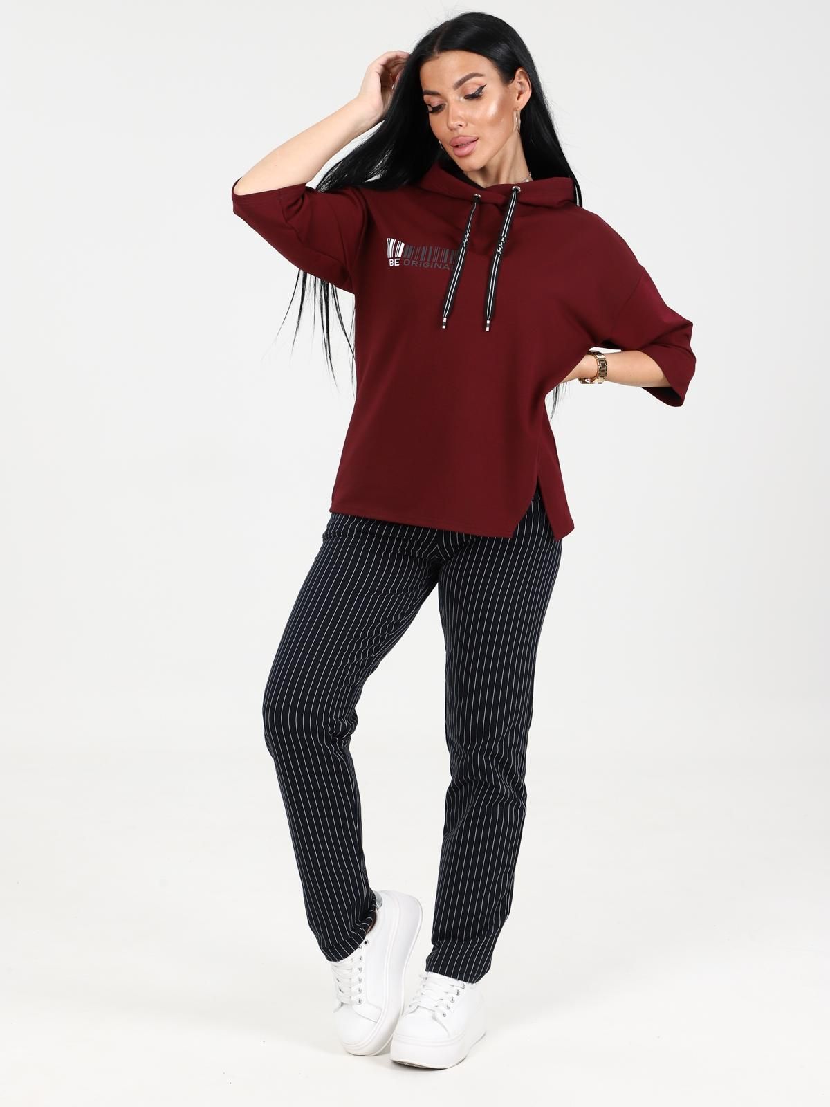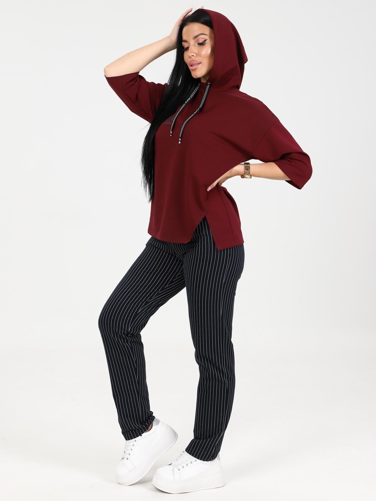 Женский трикотажный костюм состоит из кофты и брюк.Кофта прямого силуэта со спущенной линией плеча . Капюшон на люверсах с декоративной тесьмой. Рукав 3/4/. Брюки с карманами в боковых швах, верх на поясе с эластичной тесьмой.