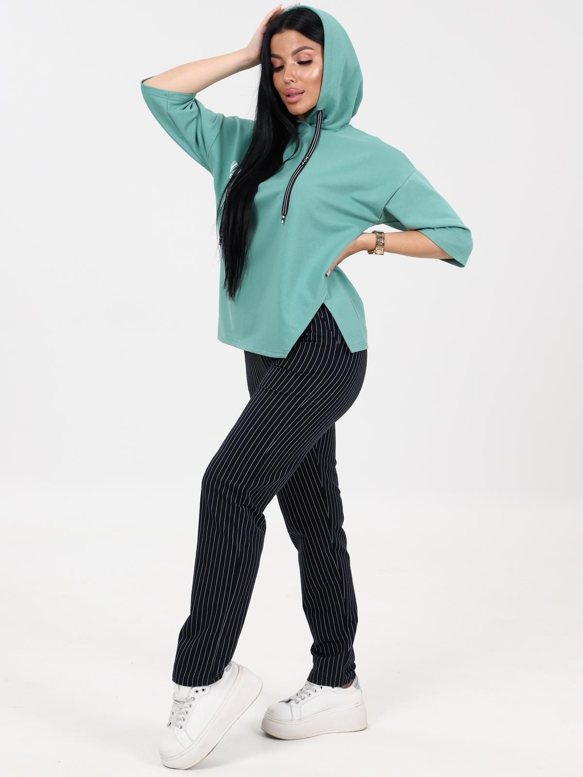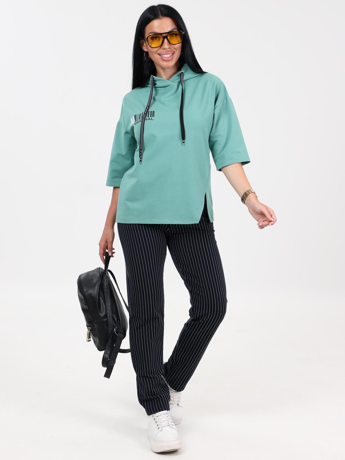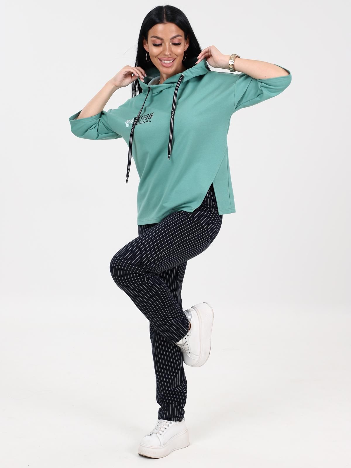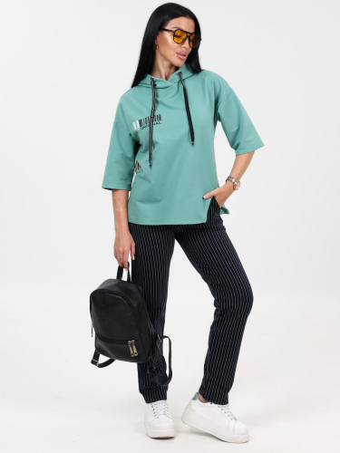 Женский трикотажный костюм состоит из кофты и брюк.Кофта прямого силуэта со спущенной линией плеча . Капюшон на люверсах с декоративной тесьмой. Рукав 3/4/. Брюки с карманами в боковых швах, верх на поясе с эластичной тесьмой.