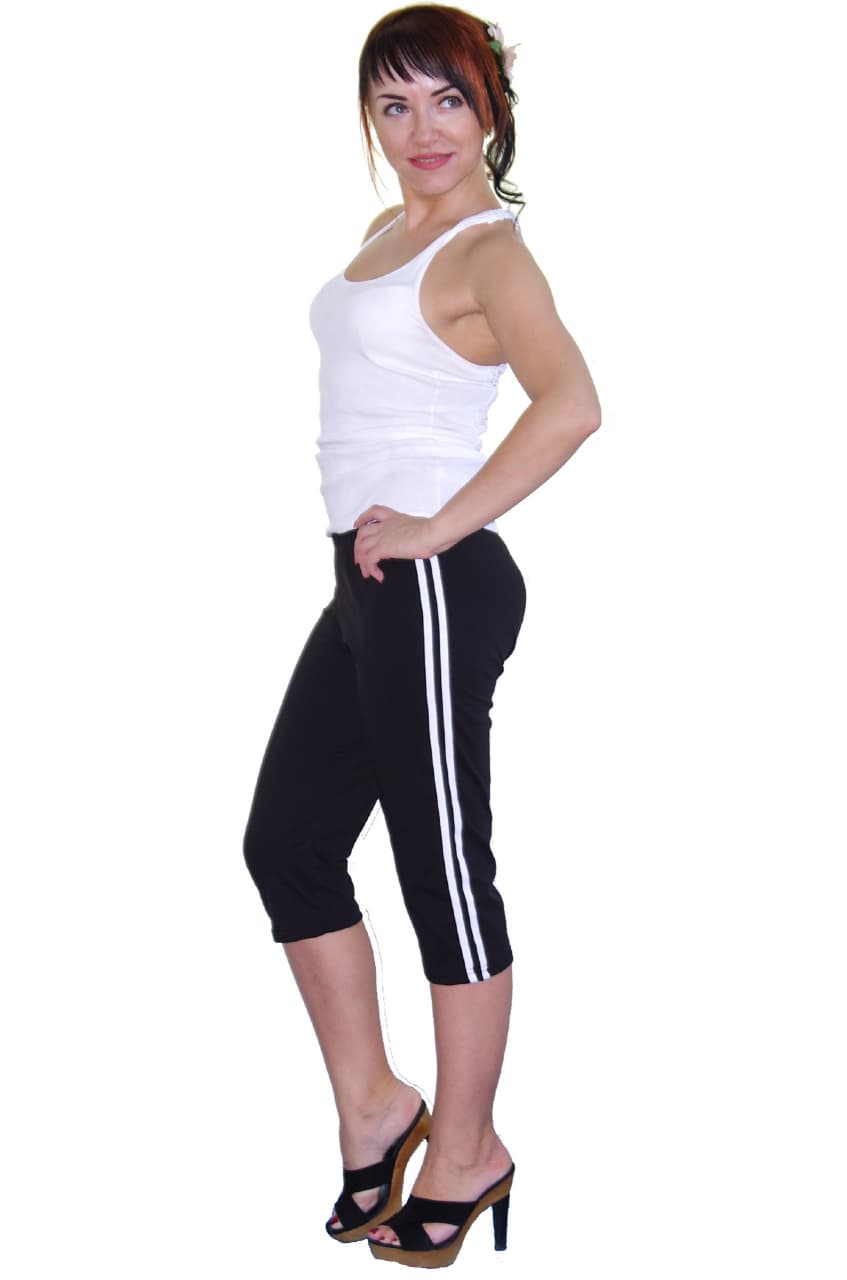 Классные женские бриджи, выполнены из эластичного кулирного полотна с лайкрой. Благодаря синтетической нити прекрасно тянутся, облегая фигуру и подчеркивая её достоинства. Бриджи декорированы контрастными лампасами из износоустойчивого материала.