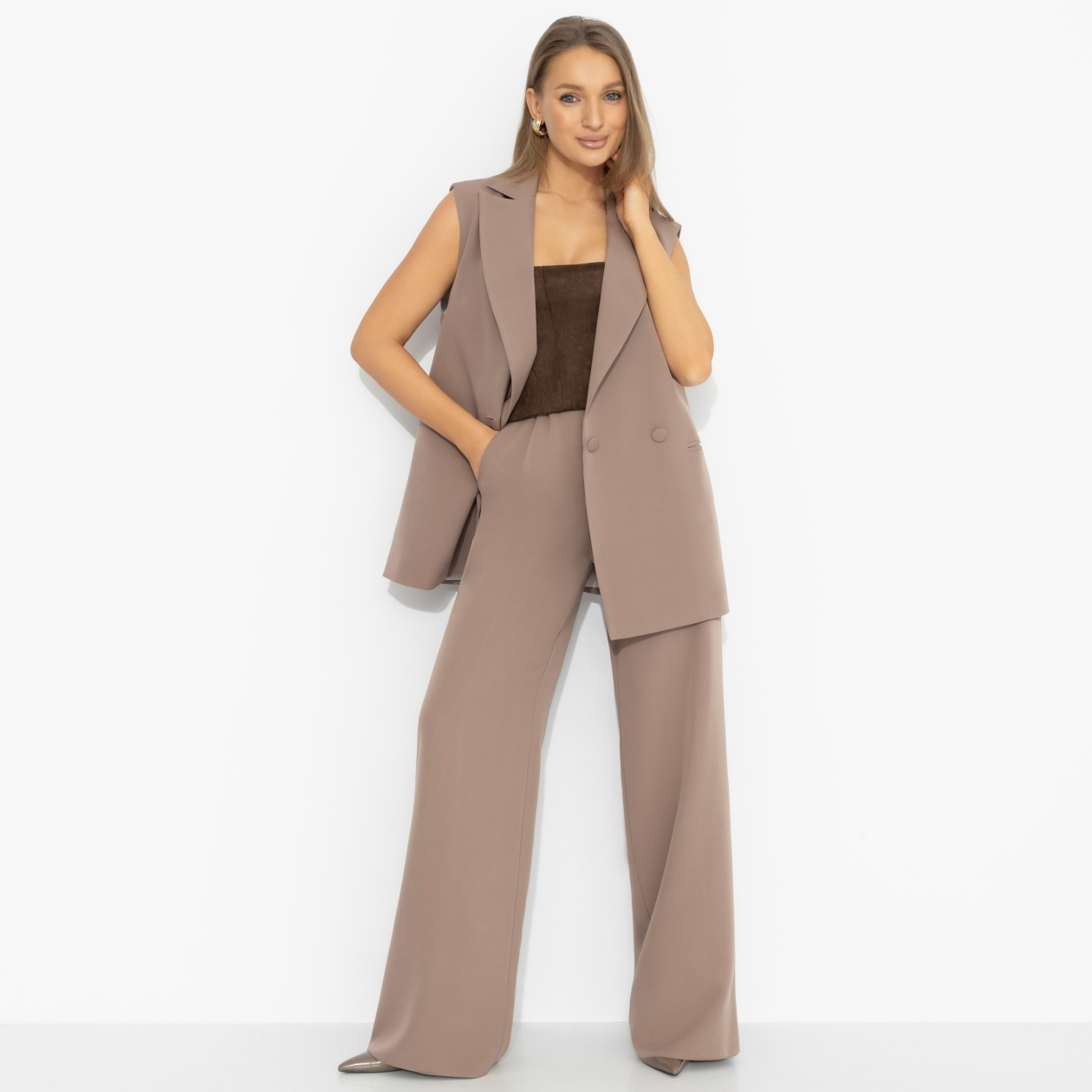 Она заходит в офис так, будто уже знает исход встречи. Главная мысль – я здесь, чтобы выигрывать. Оттенок тёплого шоколада звучит как уверенное «да». Никакой суеты, только расчёт и лёгкая улыбка в уголках губ. Архитектурный жилет формирует собранный силуэт, широкие брюки с высокой посадкой вытягивают рост. Чистый power dressing – и ставка сыграна.