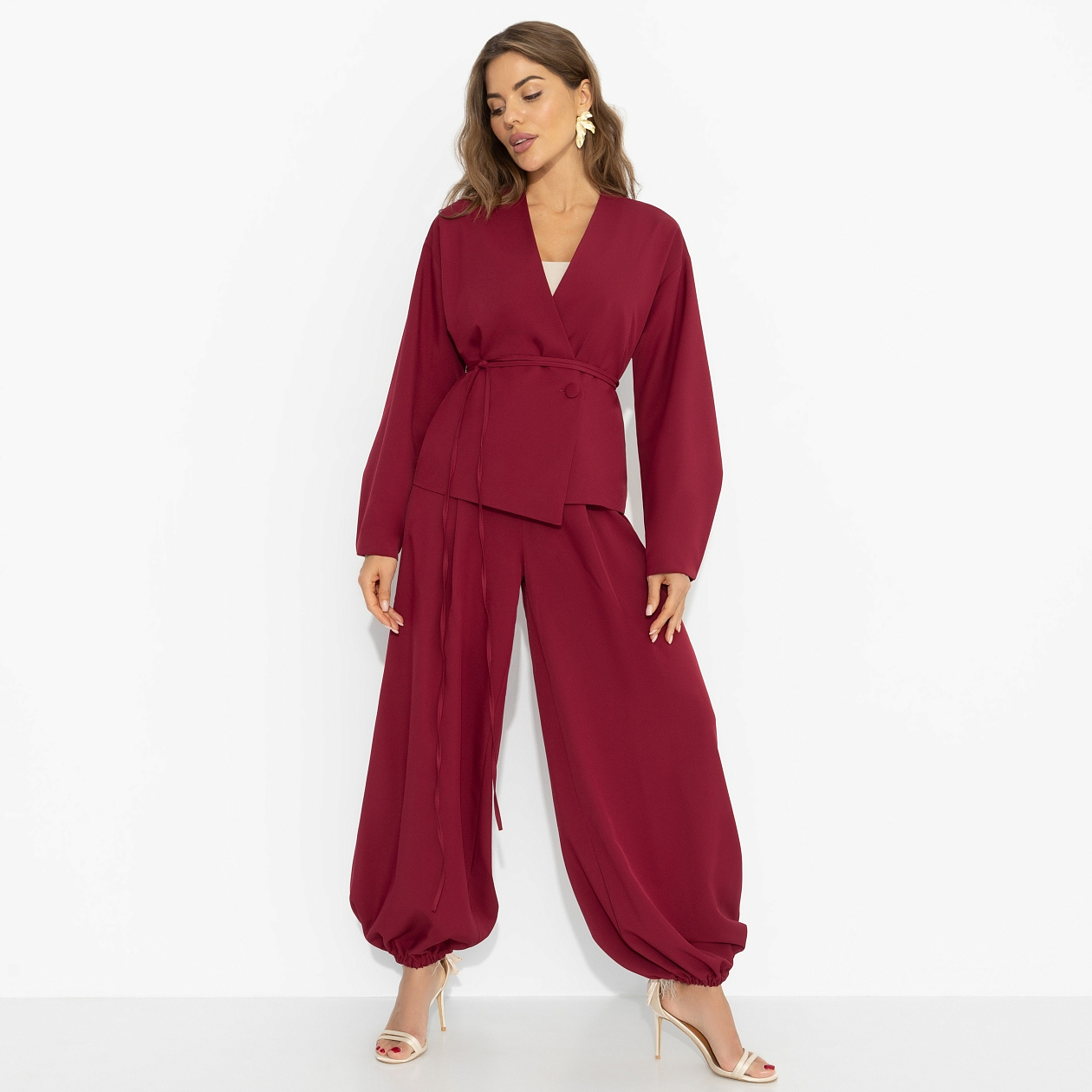 Она выходит на террасу старинного особняка, ветер играет с тканью, в воздухе – запах специй и напряжённая тишина, как в сценах «Великолепного века». В этом образе есть восточная глубина и скрытая сила: мягкость движений, взгляд с тайной, рубиновый цвет, который понятен без слов. Костюм из ткани с вискозой очень хорош для образов в теплую погоду. Жакет подчёркивает талию, свободные брюки добавляют драматичной лёгкости. Твой естественный магнетизм, который врезается в память.
