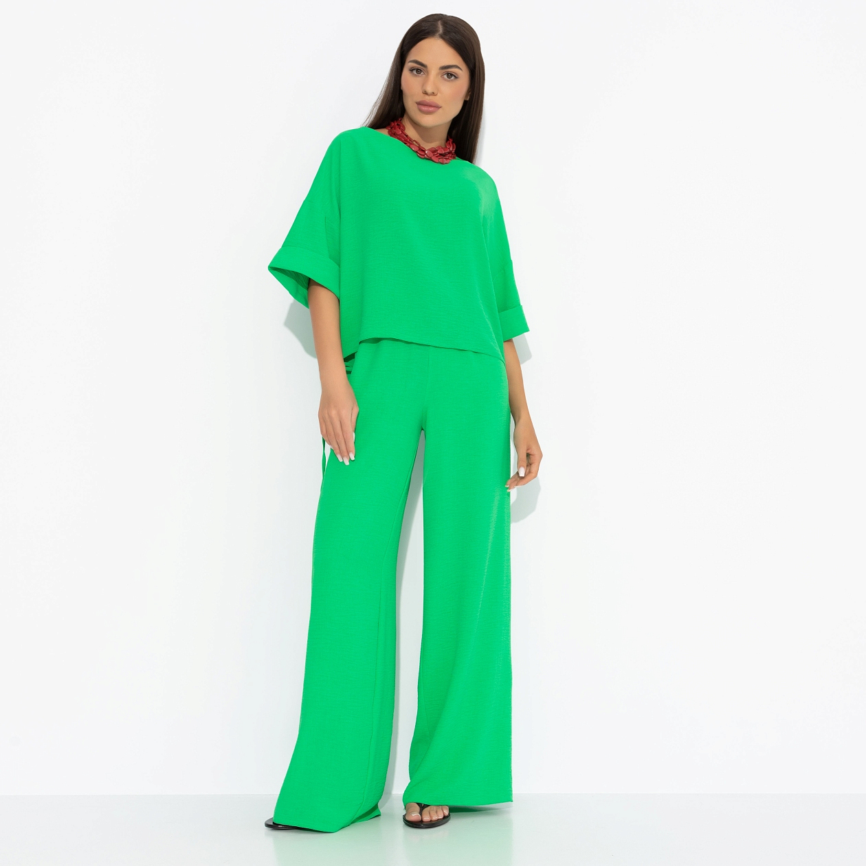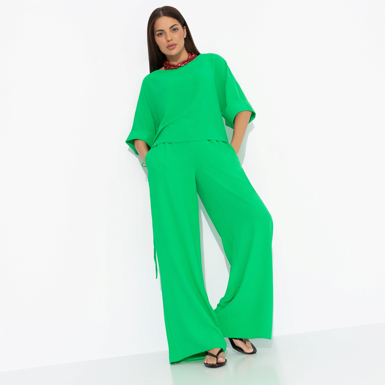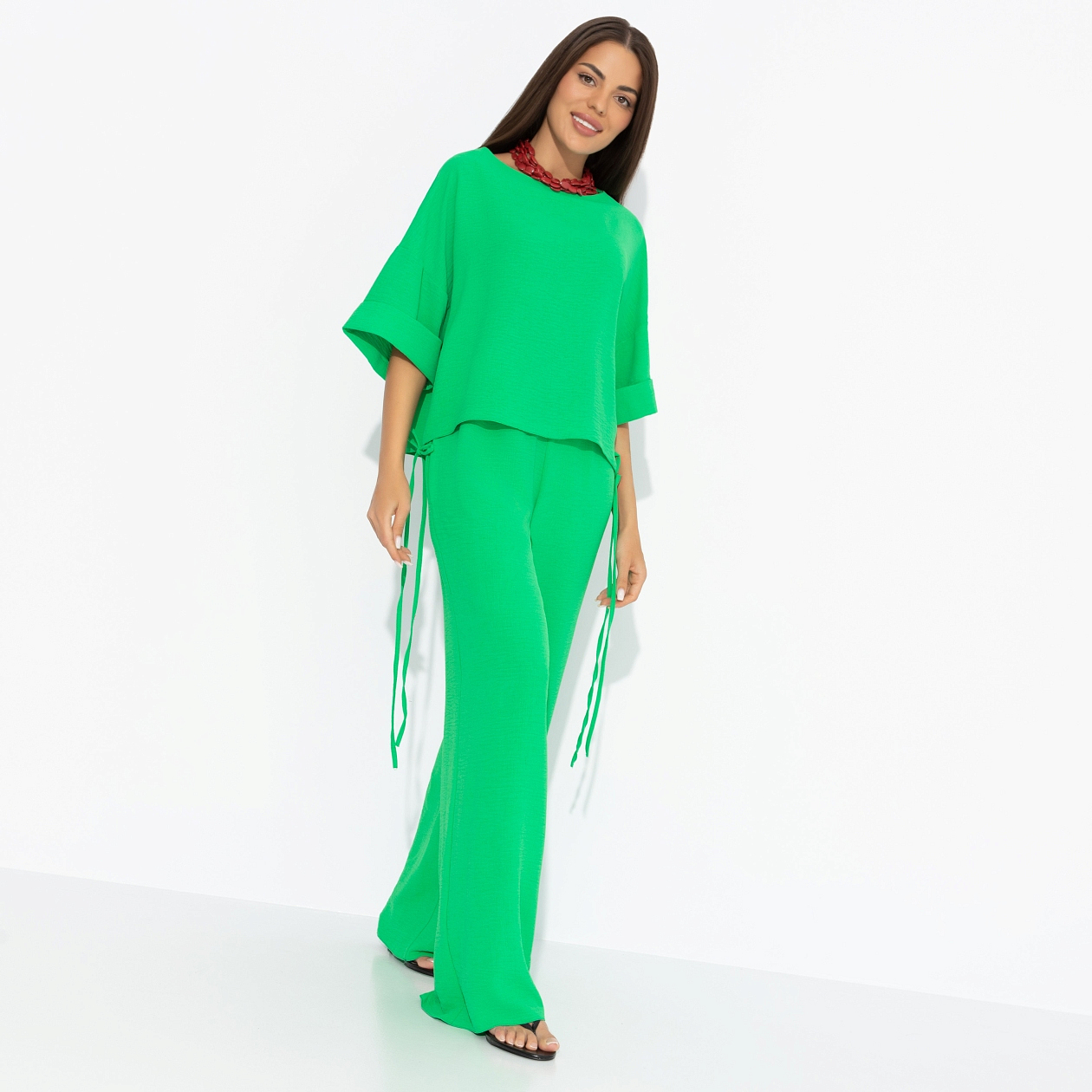 Этот костюм – не просто образ, а зелёный свет на все мечты. Мы в CHARUTTI знаем: свобода начинается с правильного оттенка и удобных брюк. Комплект состоит из широких брюк и блузы. Линия плеча спущена. Есть тонкие завязки по подолу и изделия. Пояс брюк на широкой скрытой резинке. Есть карманы.