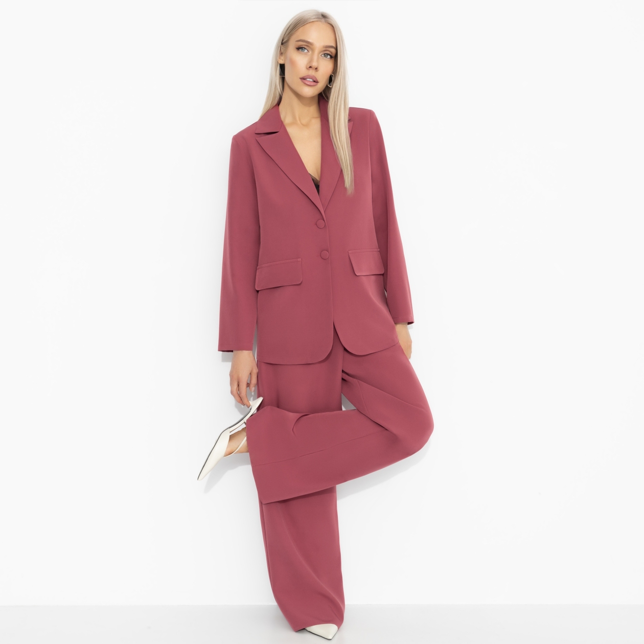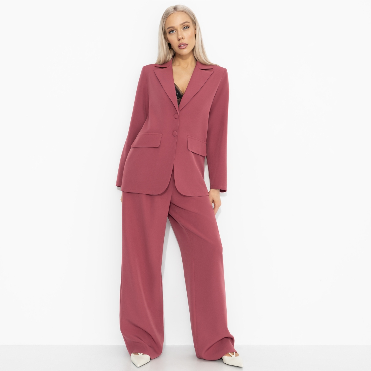 Сегодня на деловом: уверенный шаг, острый взгляд, телефон с важными звонками, кофе навынос и планы, от которых у конкурентов лёгкая паника. Брючный костюм ЧАРУТТИ создан для серьезного образа офисной сирены – той, что умеет очаровывать и побеждать одновременно. Костюм из крепа «барби». Жакет элегантного силуэта с лацканами и застёжкой на пуговицы, брюки свободного кроя с высокой посадкой. Ткань плотная, комфортная в носке, хорошо держит форму и выглядит безупречно.