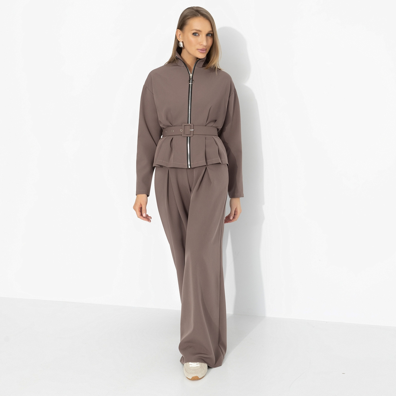 Ты идёшь на встречу, где все «очень важные», и вдруг понимаешь – на самом деле, важнее всех ты. Уверенность не кричит, она застёгивается на молнию и регулируется поясом. Оттенок густого мокко – как горький шоколад без сахара: не для всех, но точно про характер. Жакет с чёткой вертикалью молнии и поясом акцентирует талию, формируя точный силуэт, брюки с высокой посадкой и защипами мягко вытягивают линию ног.