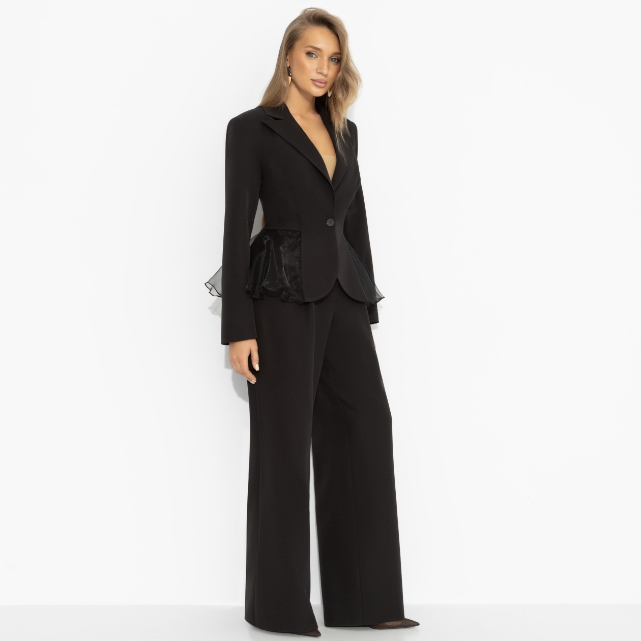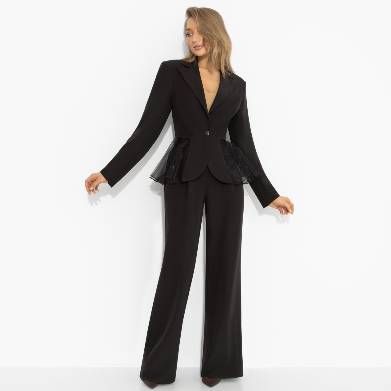 Коллеги из соседнего отдела с утра не в настроении? Скорее всего, у них просто неудобные брюки. Чего не скажешь о тебе. Чёткий жакет с акцентом на талию, идеальная посадка и свободные, не ограничивающие движения брюки создают баланс силы и комфорта. Ты спокойна, собрана и знаешь – решение в твою пользу принято единогласно ещё до первого голосования.