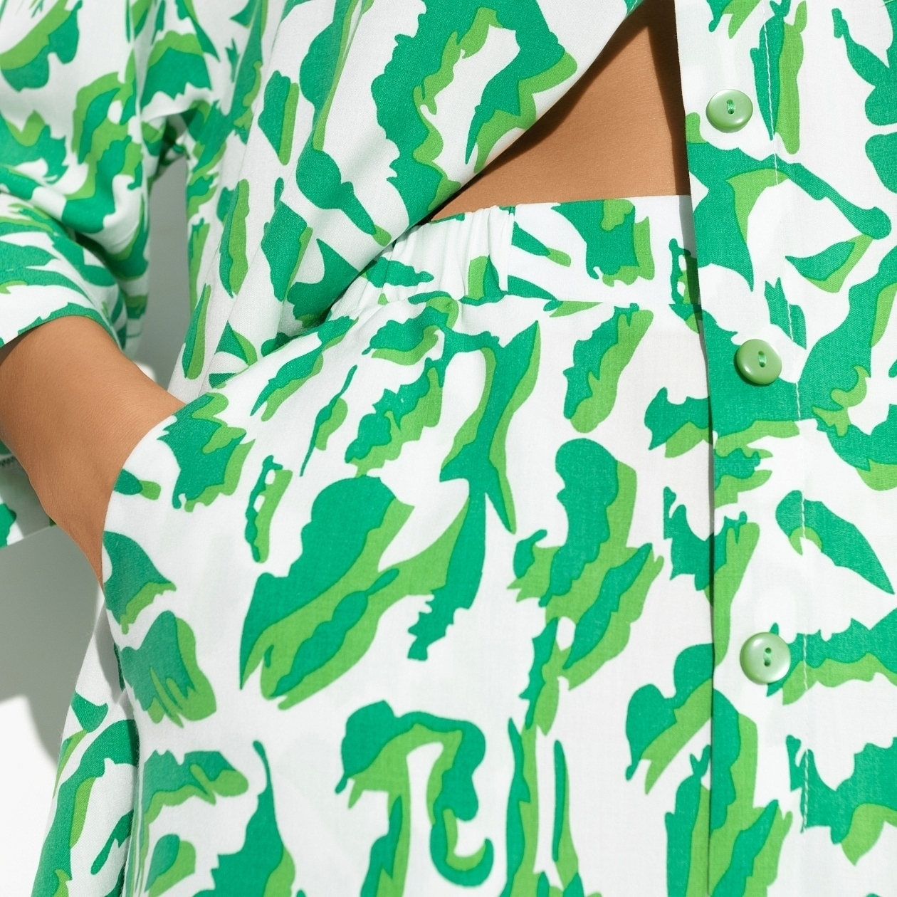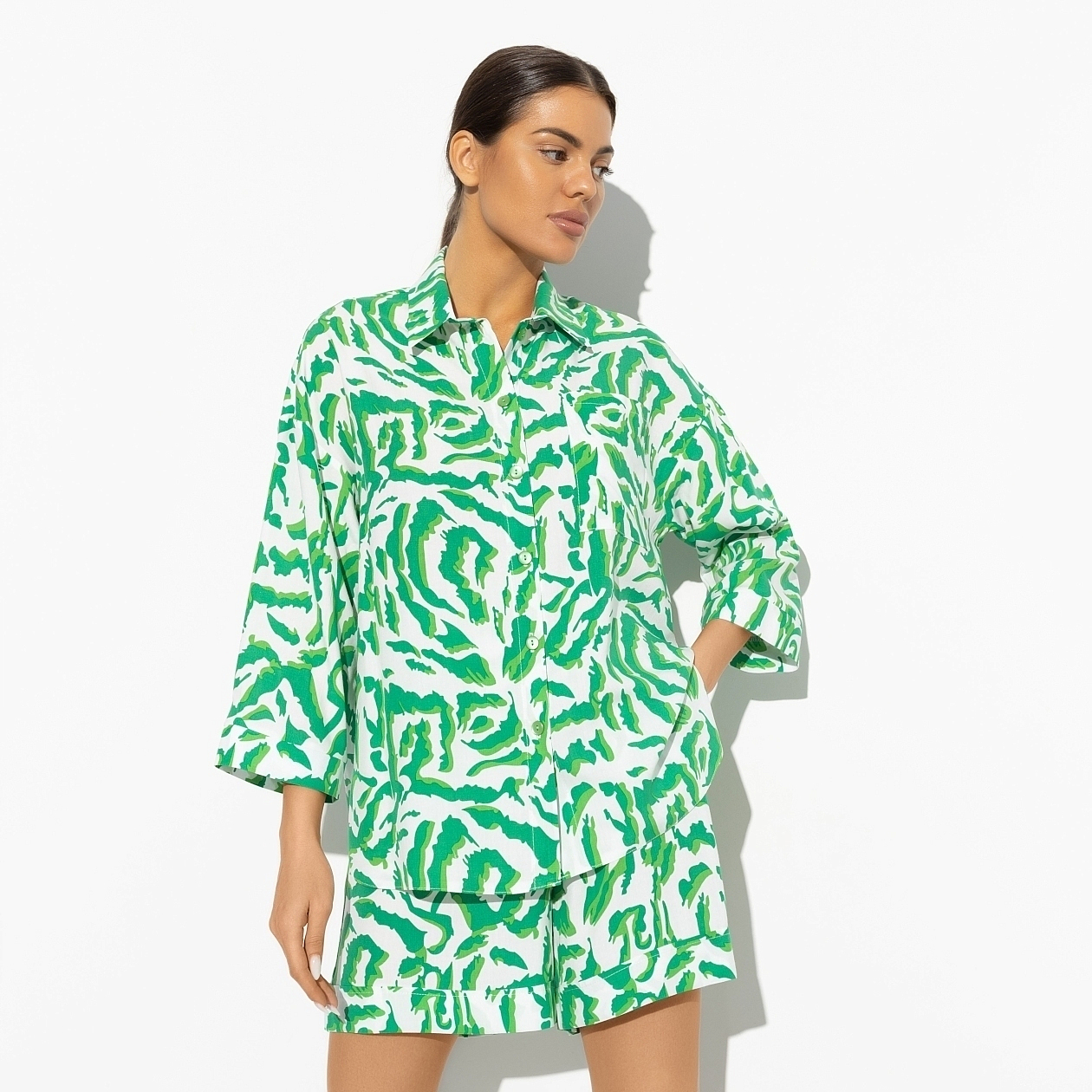 Матча на кокосовом молоке, салат из рукколы и в цветочный магазин, выбирать растения для вашего дома. Жизнь в зеленом цвете – спокойная, гармоничная и насыщенная кислородом. Костюм из оверсайз рубашки с карманом (длина рукава три четверти) и шорт на резинке. Оба изделия свободного кроя. Идеальная посадка на любую фигуру.