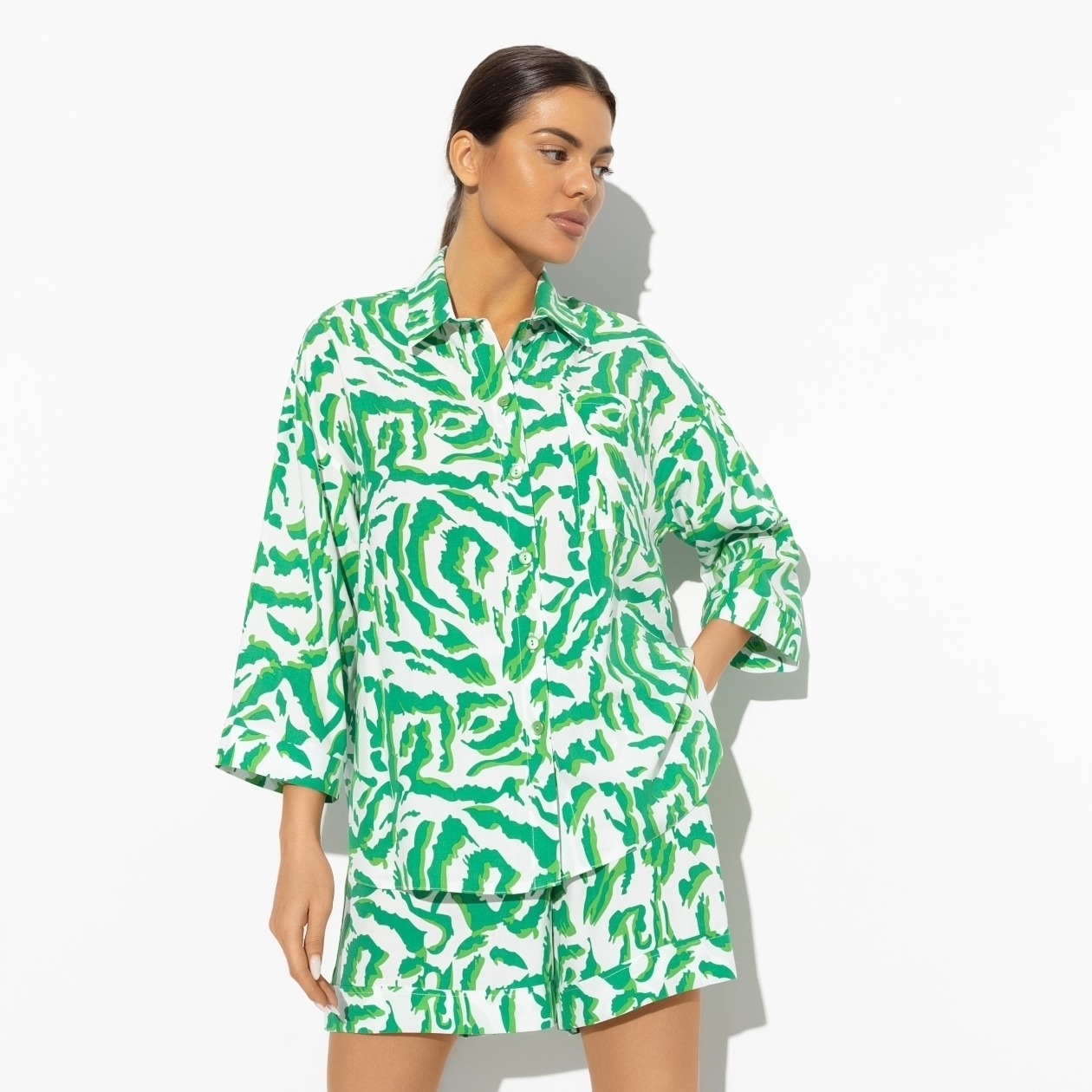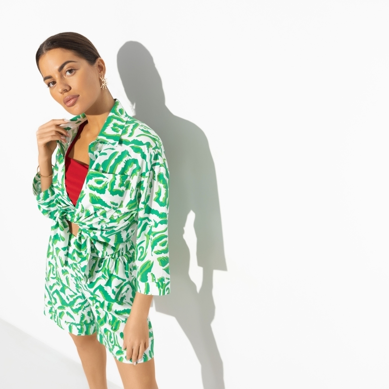 Матча на кокосовом молоке, салат из рукколы и в цветочный магазин, выбирать растения для вашего дома. Жизнь в зеленом цвете – спокойная, гармоничная и насыщенная кислородом. Костюм из оверсайз рубашки с карманом (длина рукава три четверти) и шорт на резинке. Оба изделия свободного кроя. Идеальная посадка на любую фигуру.
