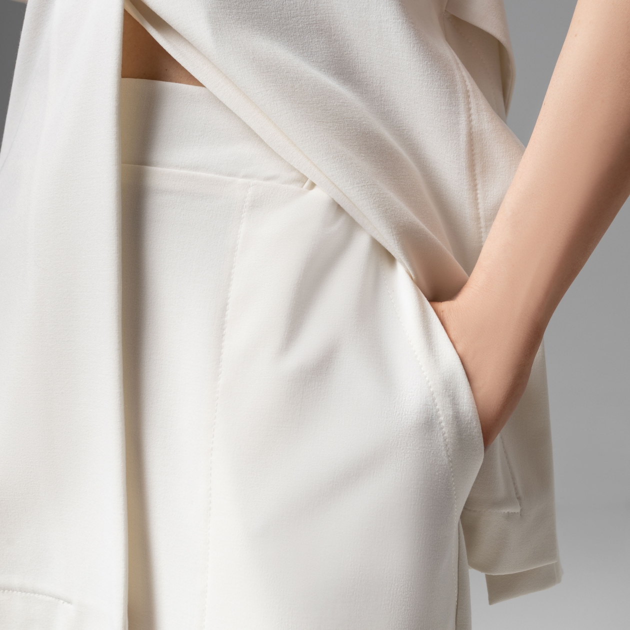Олицетворение утонченности стиля old money. Изготовлен из высококачественной костюмной ткани по тщательно выверенным лекалам. Безупречная посадка дополнена акцентной фурнитурой. Костюмный ансамбль гарантирует комфорт движений. Используйте детали в виде шелкового платка или длинных бус, чтобы дополнить образ. Комплект состоит из блузы прямого кроя с коротким рукавом и широких прямых брюк. Акцентная деталь по спинке в виде вшитого пояса. Есть разрезы по боковым сторонам изделия. Высокая посадка брюк на талии на резинке. Брюки с карманами.