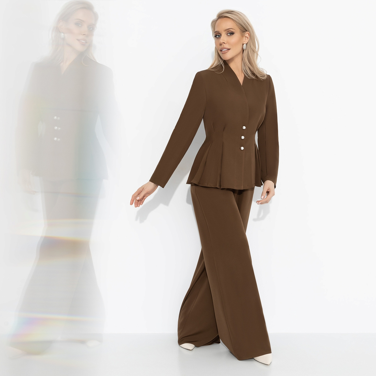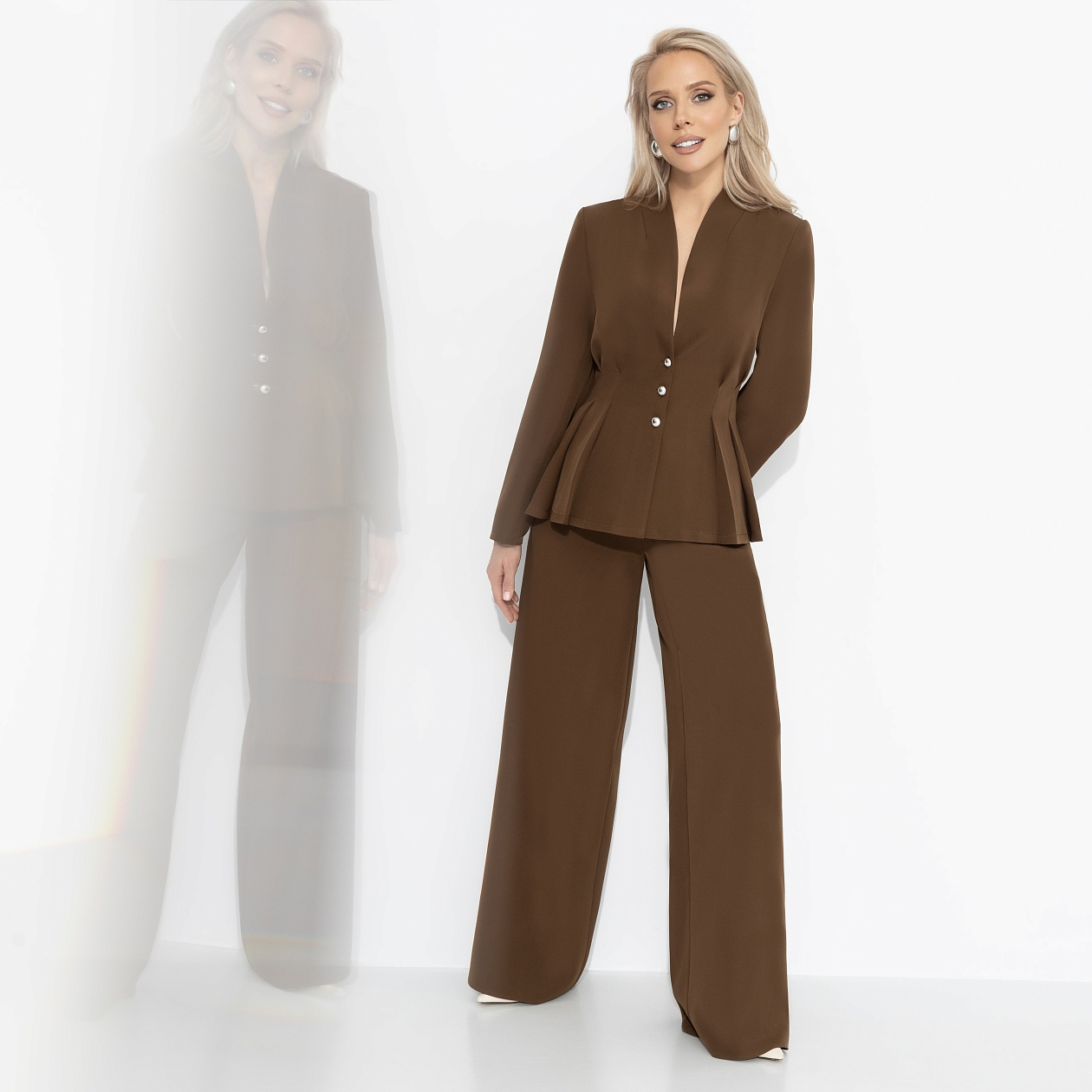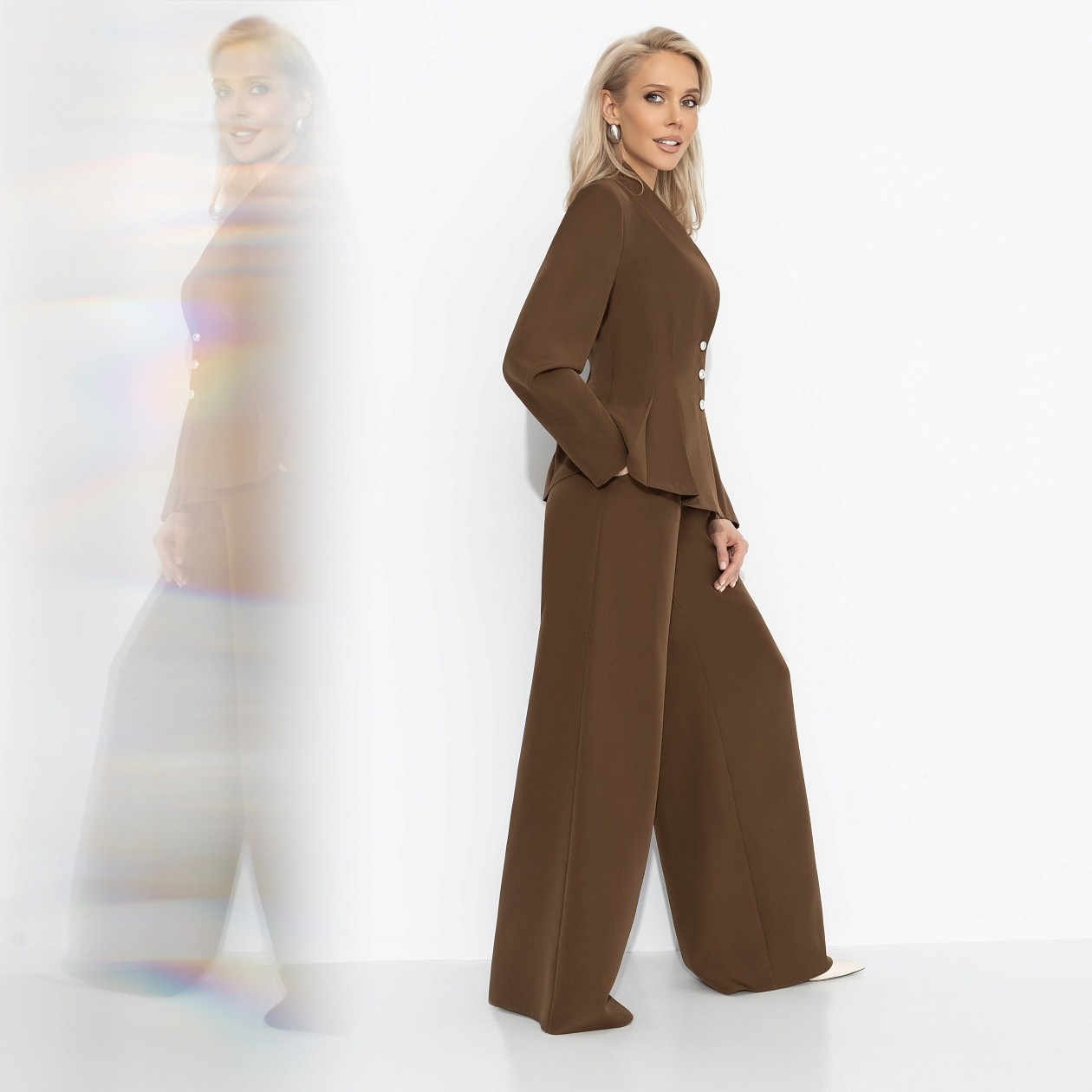 Этот костюм – прямая отсылка к стилю Джейн Биркин, символа легкости, естественного шарма и свободы 70-х. Дерзкий коричневый, свободные брюки, минималистичный жакет – словно прогулка по Монмартру, где каждый взгляд ловит солнечный свет и дыхание эпохи. Для тех, кто хочет почувствовать себя героиней винтажного фильма. Лучший выбор для новых творческих встреч и вечерних городских историй.