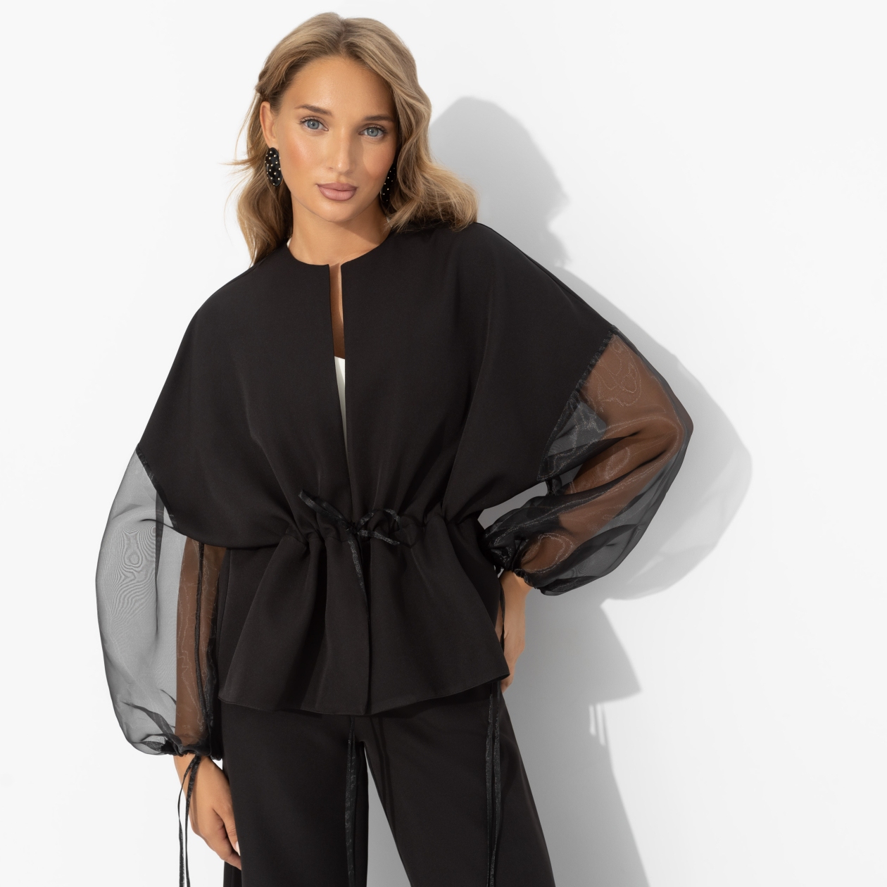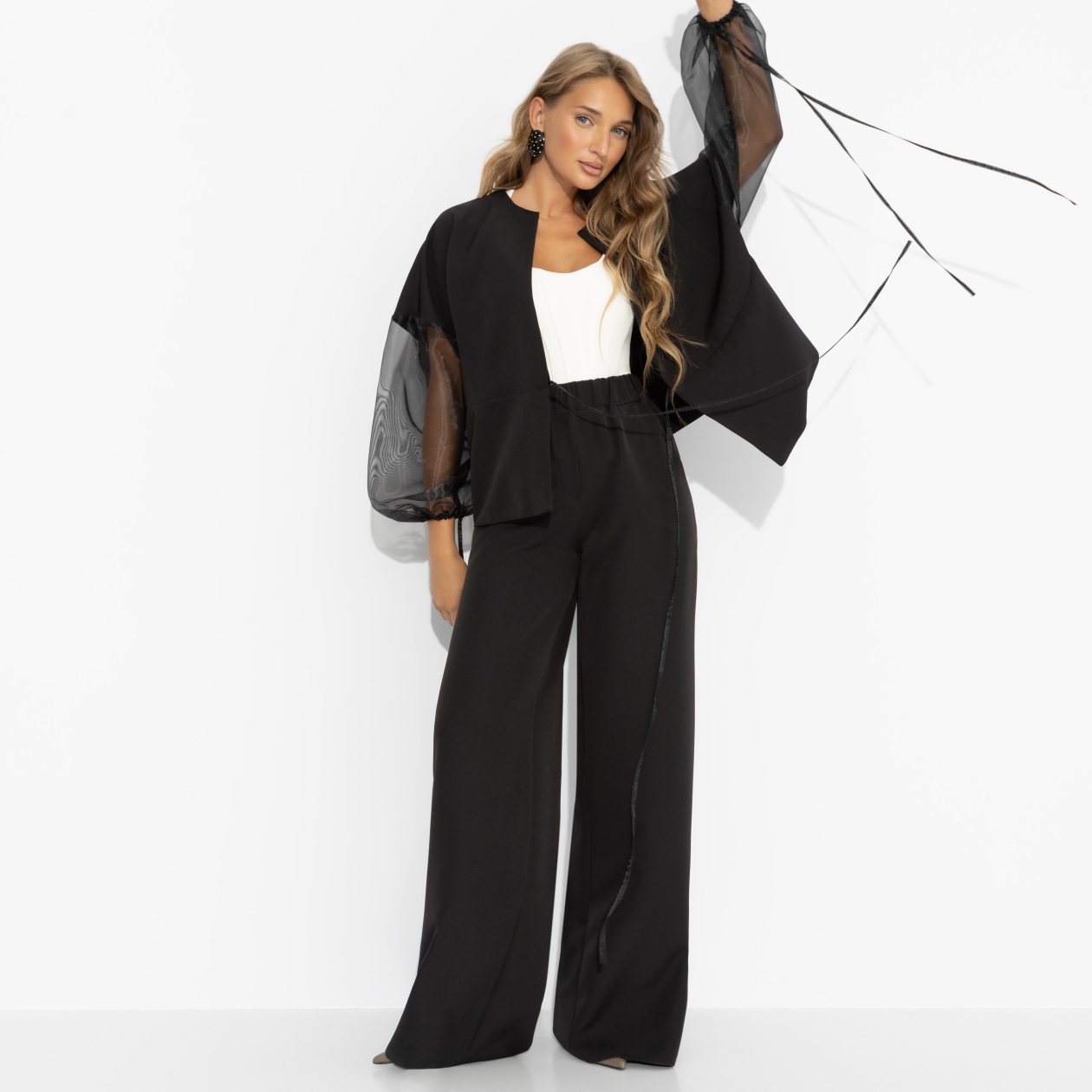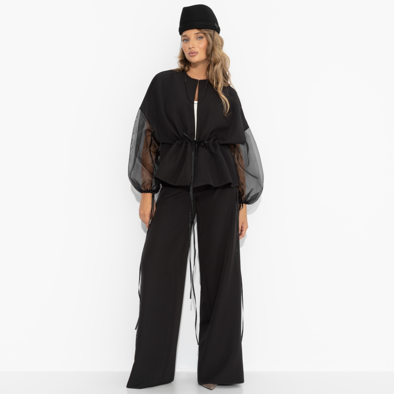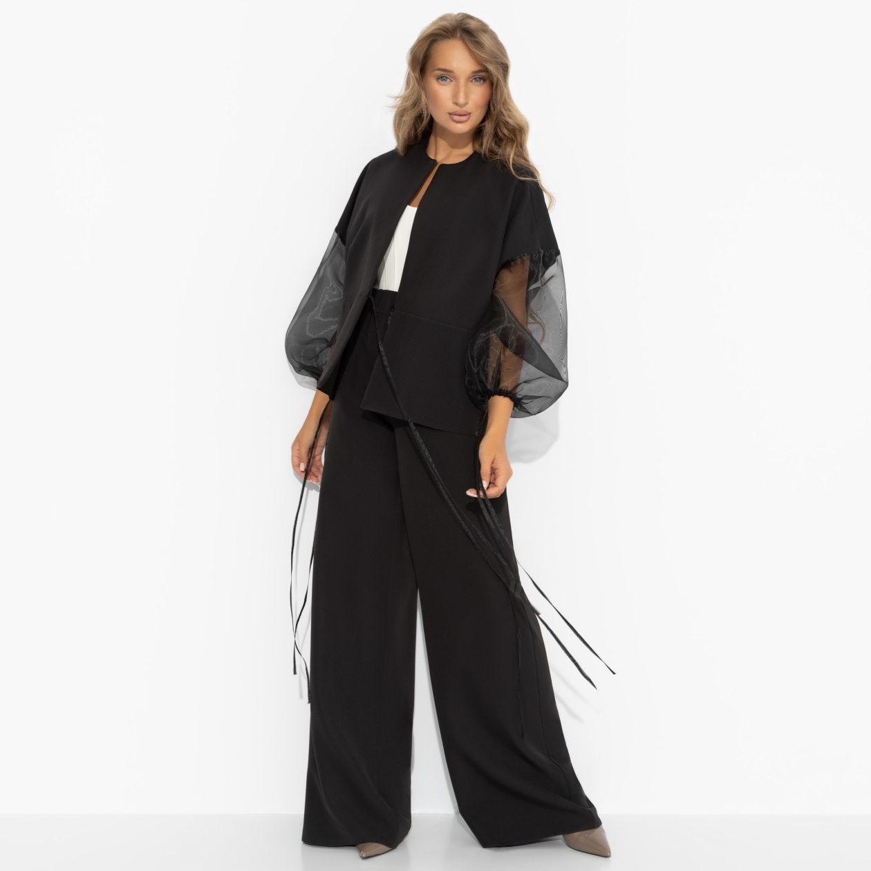Костюм ЧАРУТТИ — идеальное воплощение её двойственной натуры: строгий силуэт говорит о профессионализме, а воздушная ткань — о лёгком и игривом характере. В нём она одинаково уверенно чувствует себя на важном совещании и за бокалом вина с подругами, где её смех звенит громче любых слов. Можно быть разной, оставаясь собой: собранной, но не скучной, элегантной, но с искоркой. Комплект состоит из широких брюк и жакета свободного кроя. Брюки с высокой посадкой, с карманами. Пояс брюк на широкой скрытой резинке. Рукава жакета из органзы в тон основного материала. Рукава также оформлены тонкими завязками. Жакет с тонкими завязками в виде кулиски.