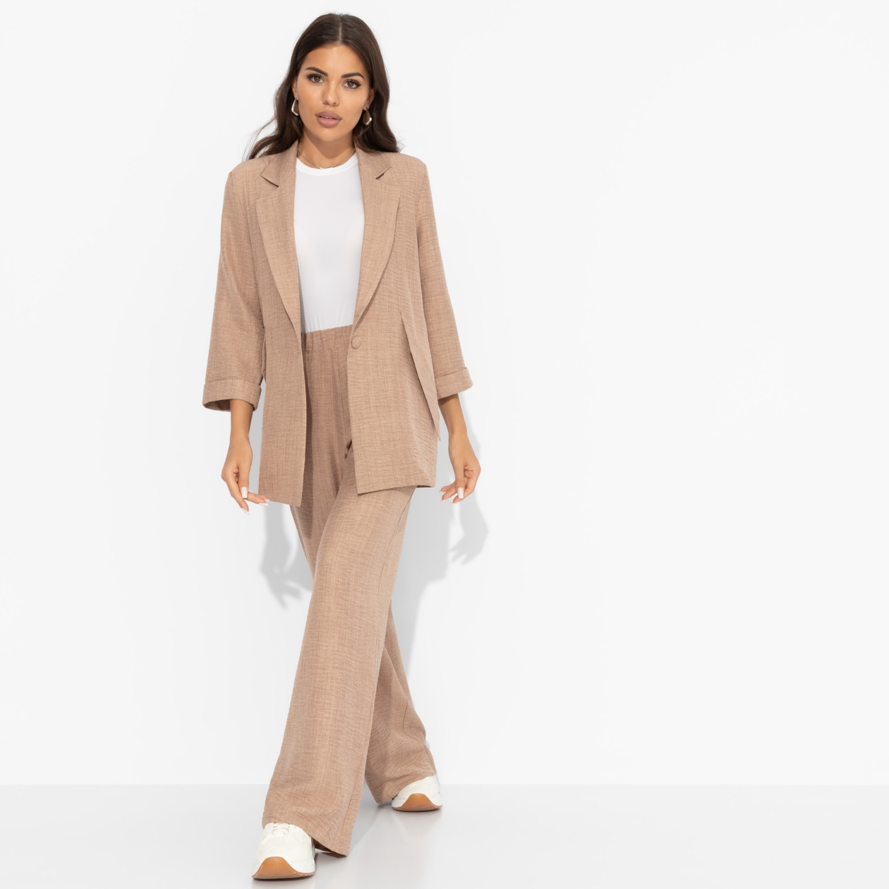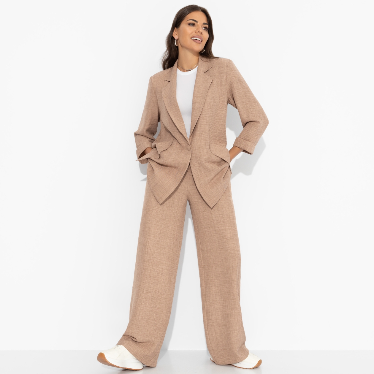 Перед вами не просто костюм. Это отражение выраженного чувства стиля, деловой хватки и мягкости характера. Безупречный микс, который есть в каждой из нас. Подчеркните свою уникальность в костюме ЧАРУТТИ. Комплект состоит из широких брюк и жакета. Жакет однобортный с лацканами свободного кроя. Рукава укорочены. Изделия удлиненное. Имитация карманов. Брюки прямые. Посадка на талии. Пояс на широкой скрытой резинке. Брюки с карманами.