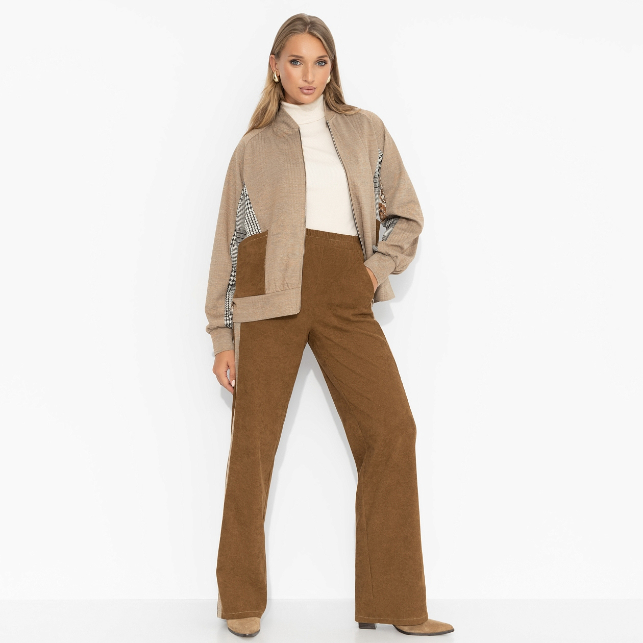 Костюм ЧАРУТТИ — ваш безупречный спутник для полета в бизнес-классе в солнечную Италию. Элегантные брюки из благородного вельвета и бомбер создают образ, который говорит о вашем статусе еще до посадки в самолет. Образ, в котором вы будете чувствовать себя комфортно во время долгого перелета и при этом безупречно выглядеть при выходе из аэропорта. Сойдите с трапа готовой к деловым встречам или прогулкам по римским улочкам. Комплект состоит из брюк прямого кроя и бомбера с карманами. Брюки с акцентными лампасами на резинке, есть карманы. Посадка высокая на талии.