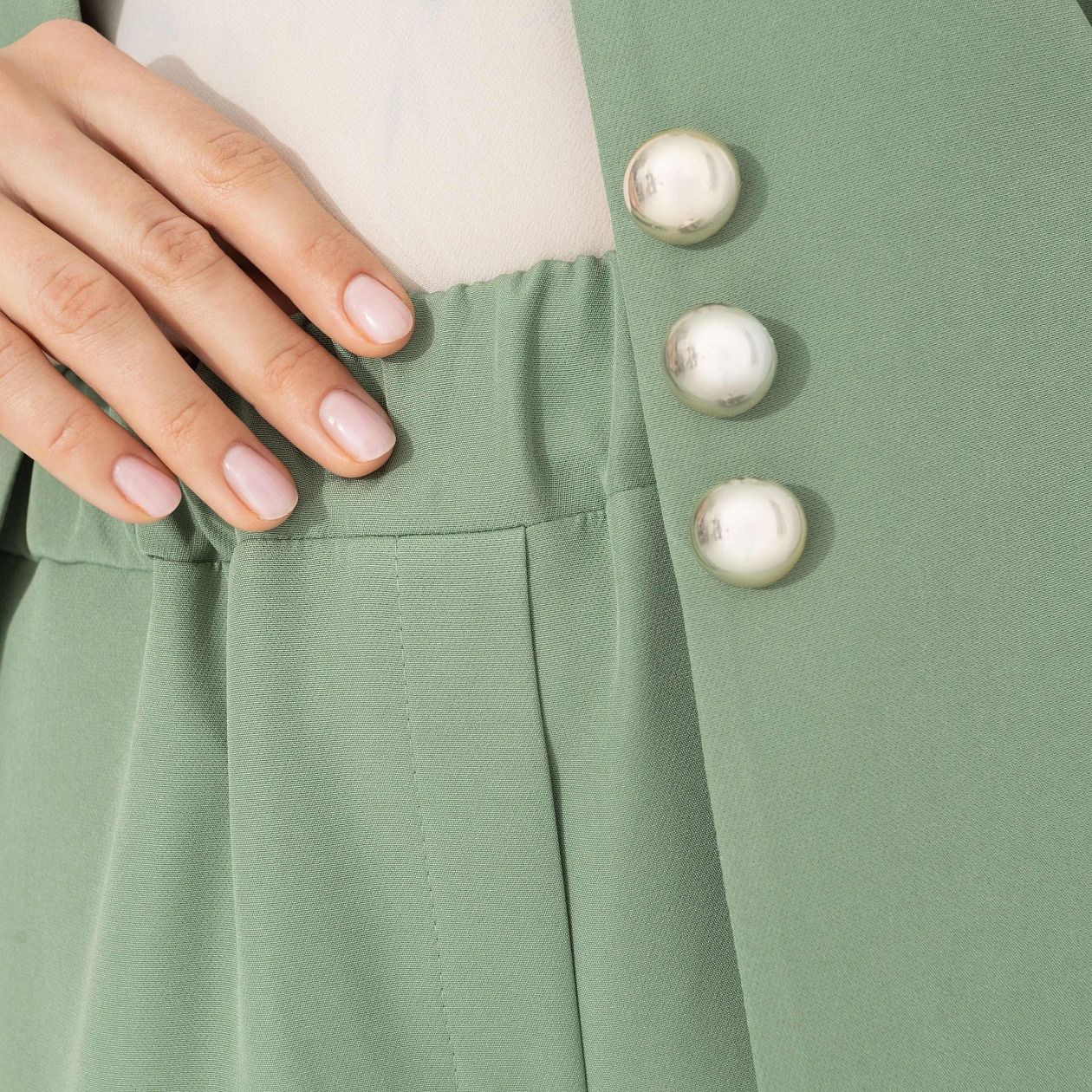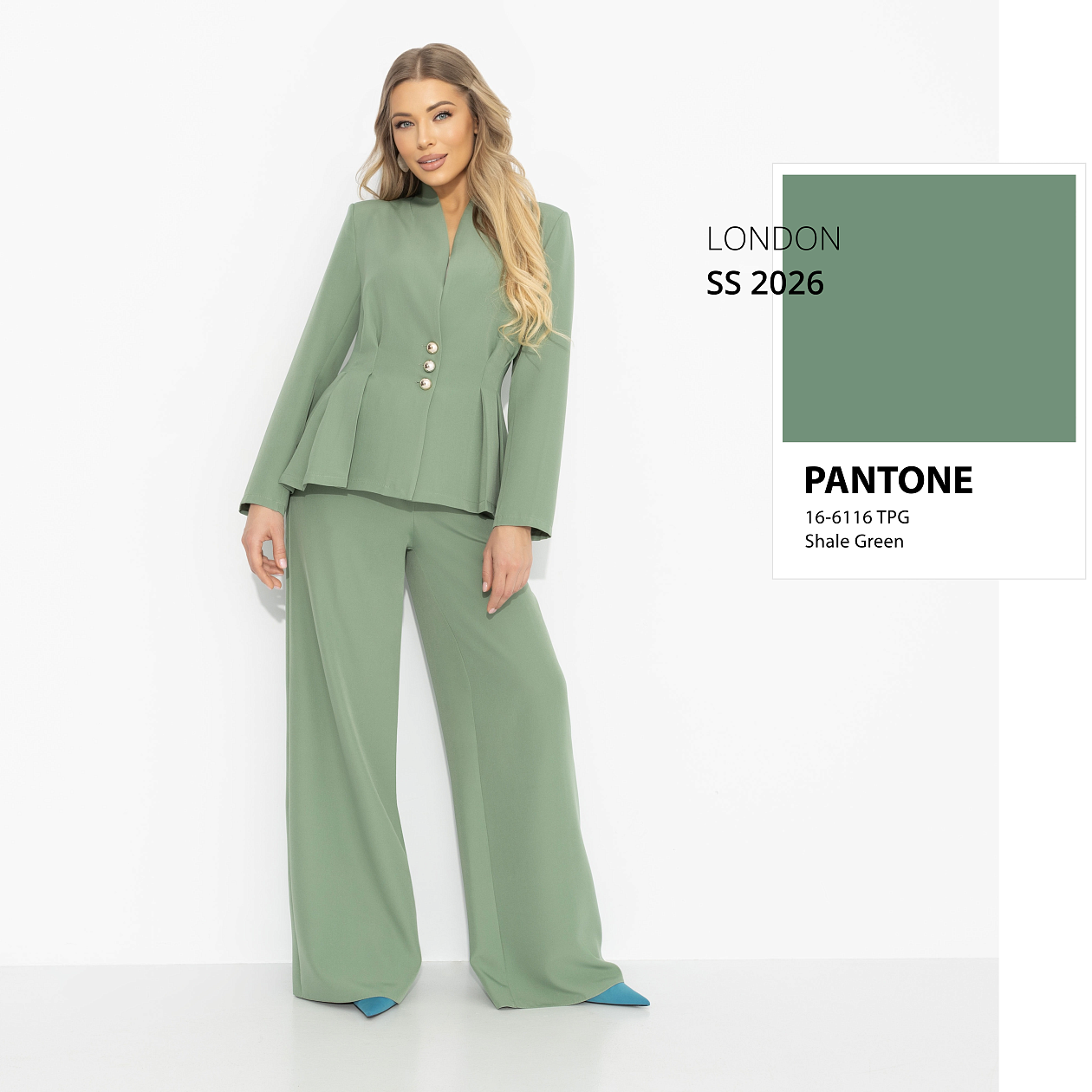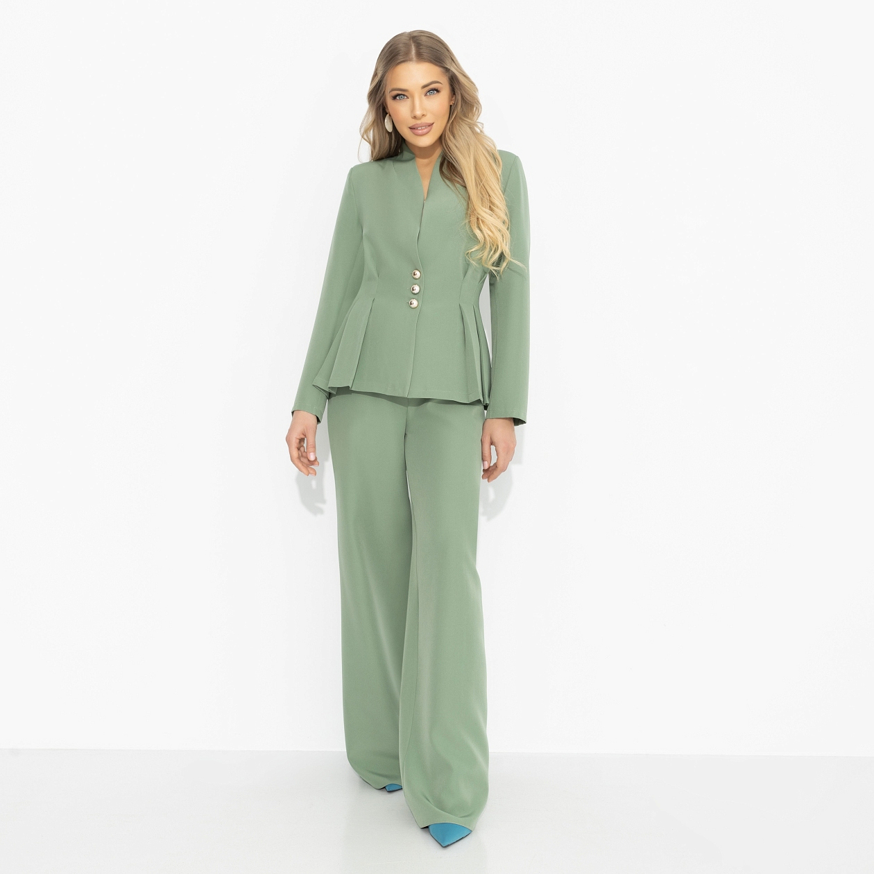Женщина в таком костюме не старается впечатлить – она просто появляется, и этого уже достаточно. Линии кроя здесь работают как архитектура влияния: акцент на талии притягивает внимание, свободные брюки эффектно сочетаются с обувью на каблуке. Гладкая фактура подчёркивает глубину нежного зеленого цвета, создавая эффект дорогой, выверенной элегантности. Образ, который запоминают без усилий.