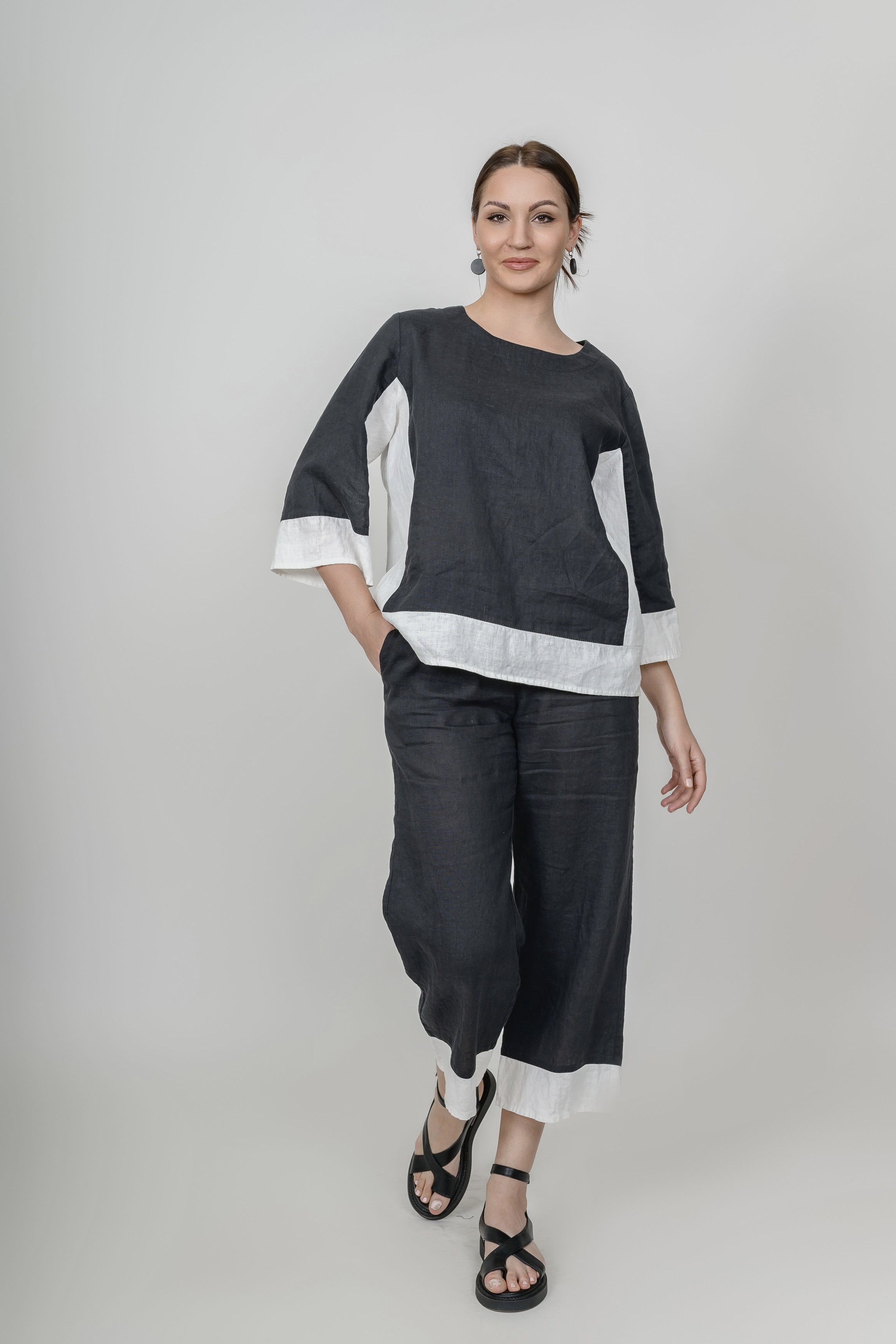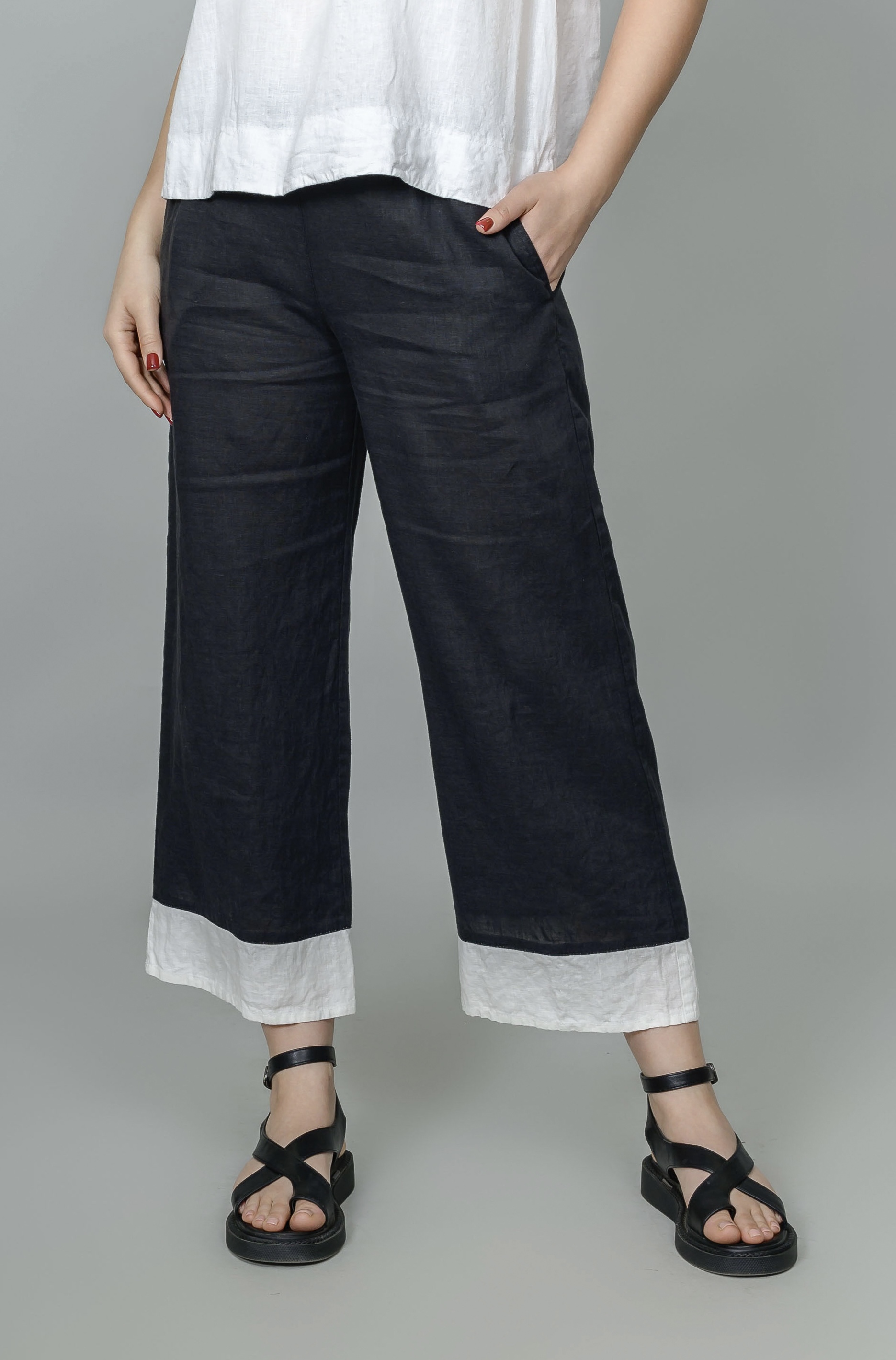 Льняные  свободные брюки-кюлоты прямого силуэта. Пояс на резинке, имеются 2 боковых кармана. Выигрышно смотрится контрастное сочетание цветов.