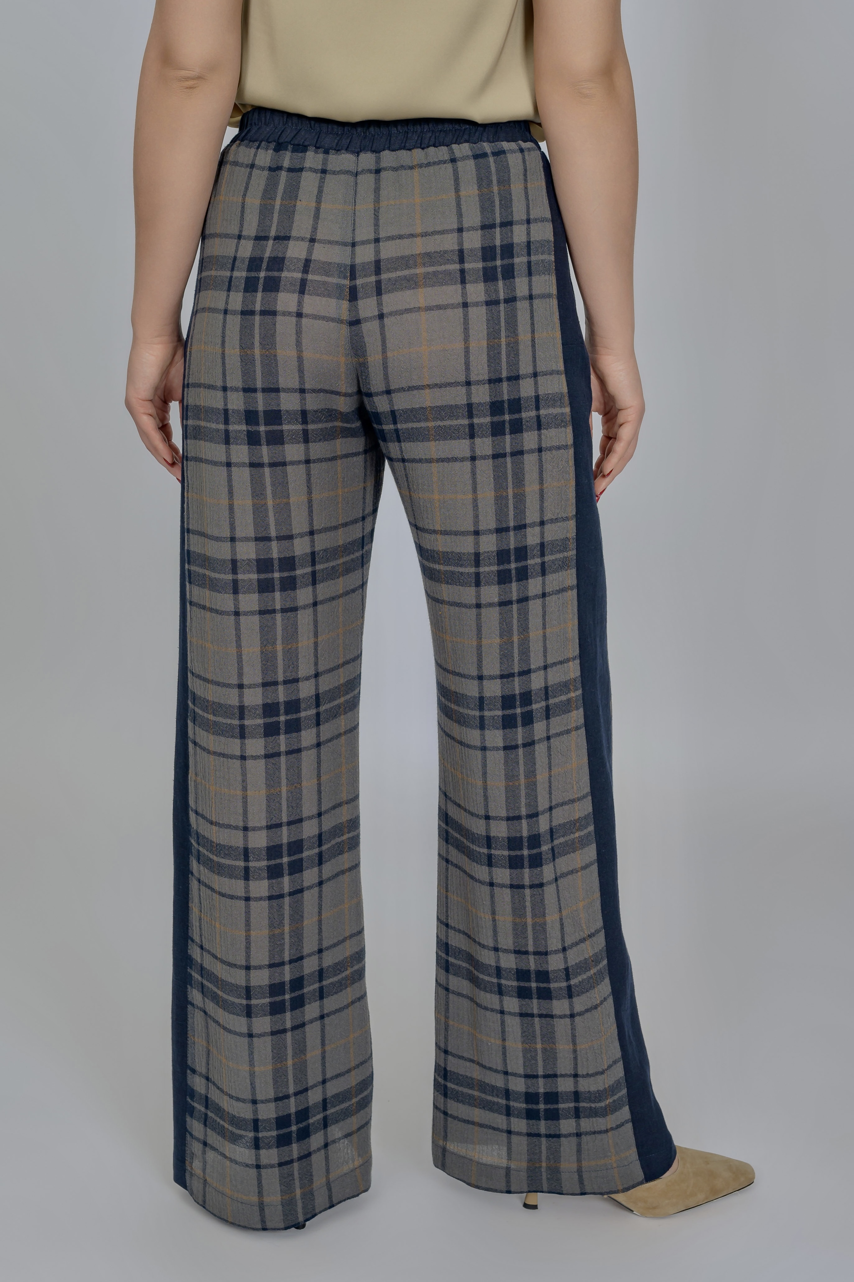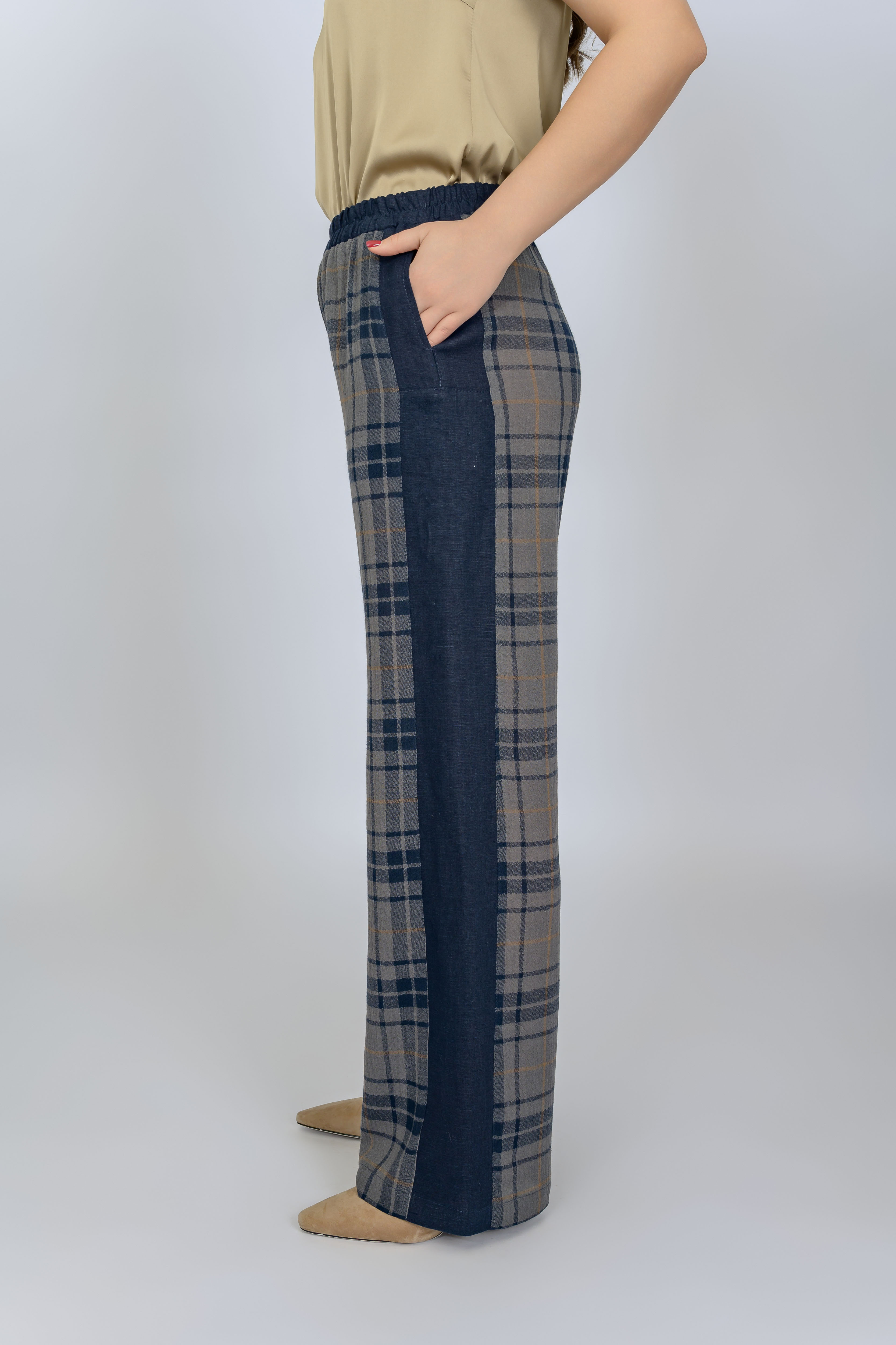 Летние прямые брюки из мягкой вискозы в сочетании с натуральной льняной тканью. Эффектная крупная клетка, дополненная однотонным темно/синим компаньоном (100% лен), делает изделие оригинальным и стильным.  Ширина брюк универсальна для фигур большой полноты. Выигрышным элементом являются однотонные лампасы, что визуально сужает полноту в области бедер.   Просвечивание исключено. Пояс на резинке. Имеются 2 боковых кармана.