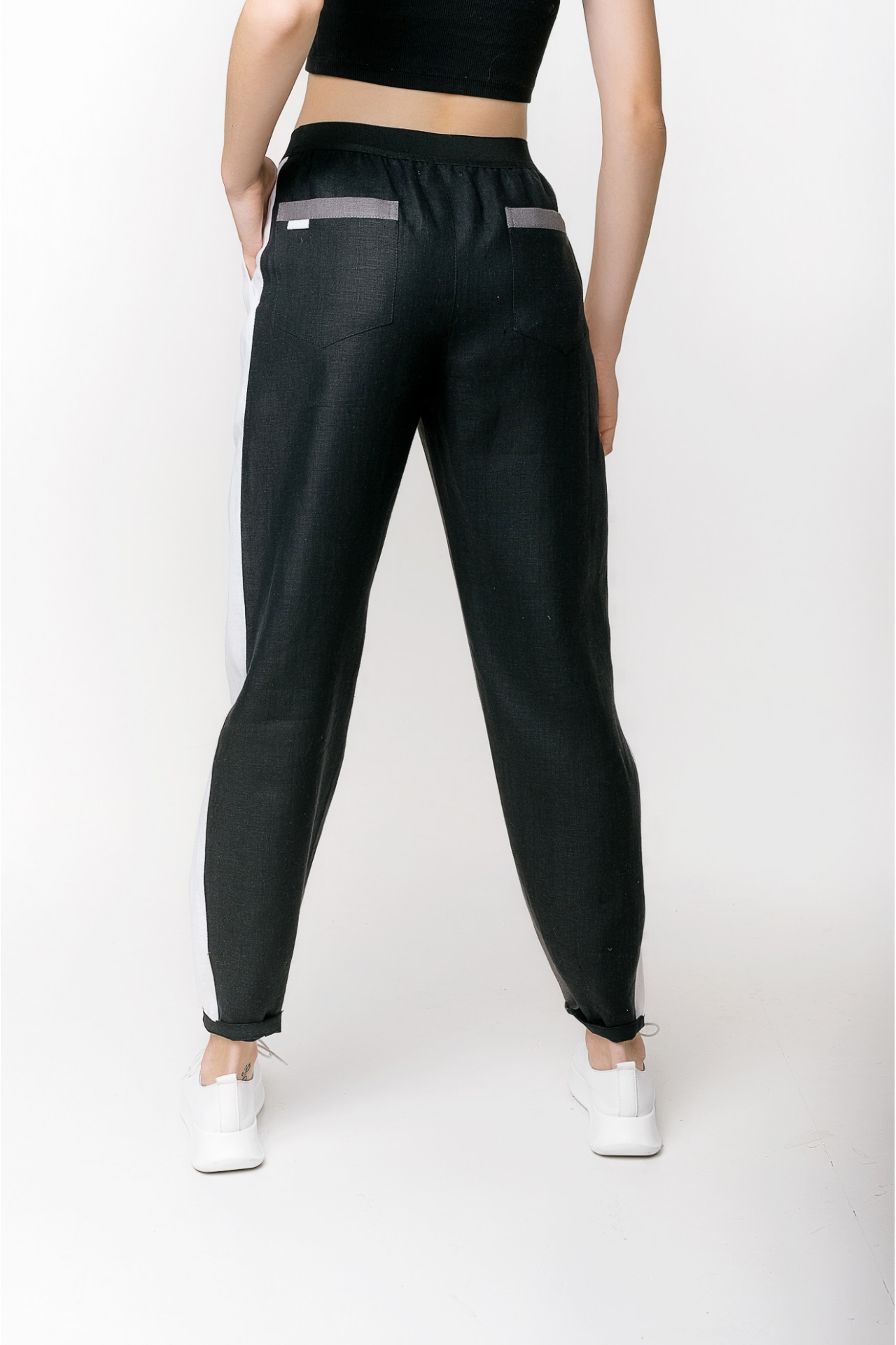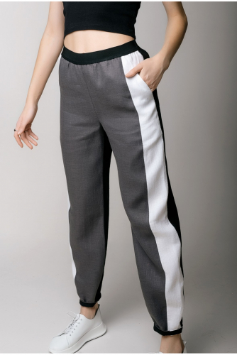 Льняные брюки в спортивном стиле, выполненные в комбинации 3-х цветов. Брюки предлагаются в комплекте с курткой арт. 065 и составляют стильный и удобный летний комплект, отлично подходящий для любой размерной и возрастной группы.