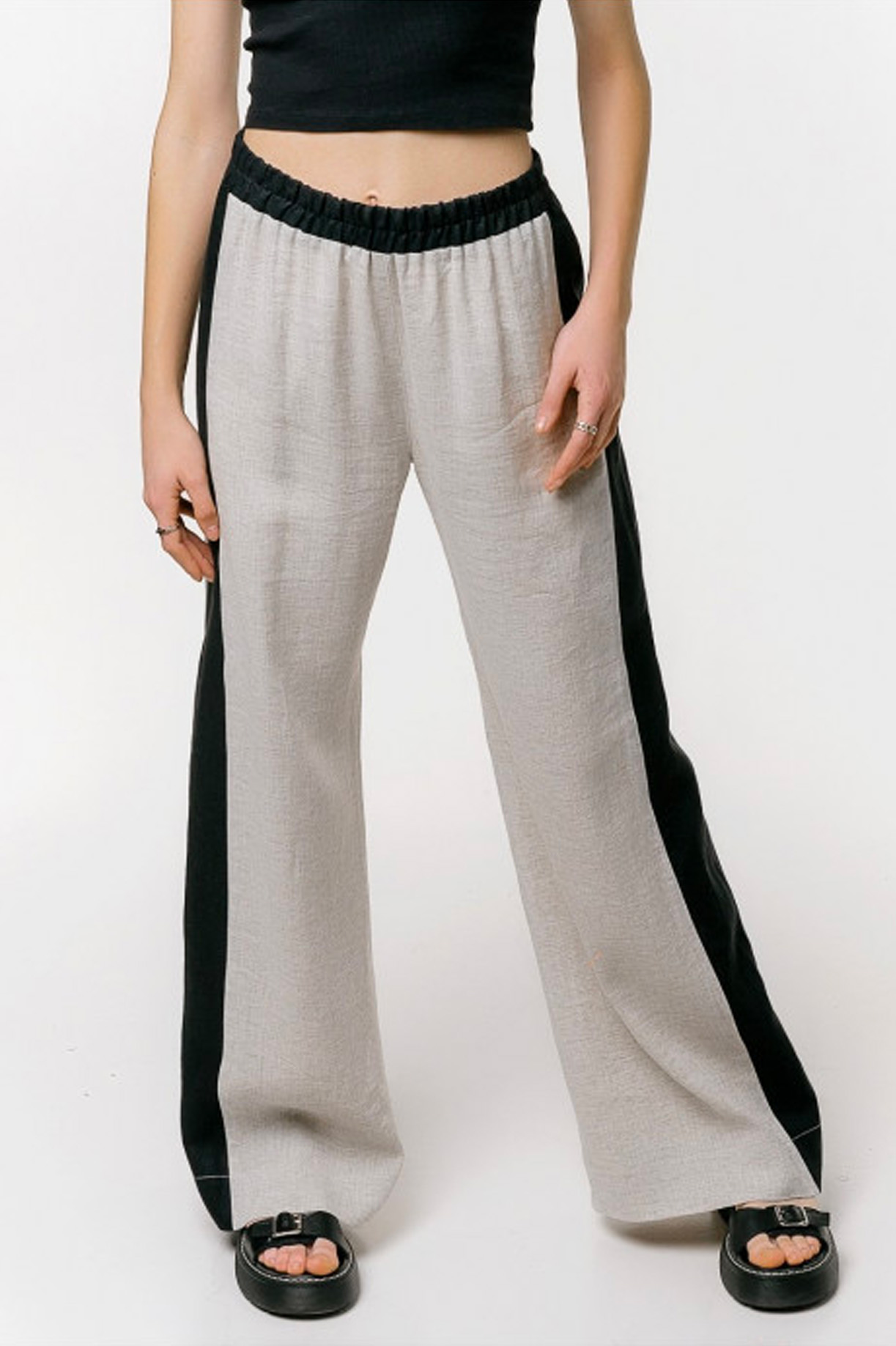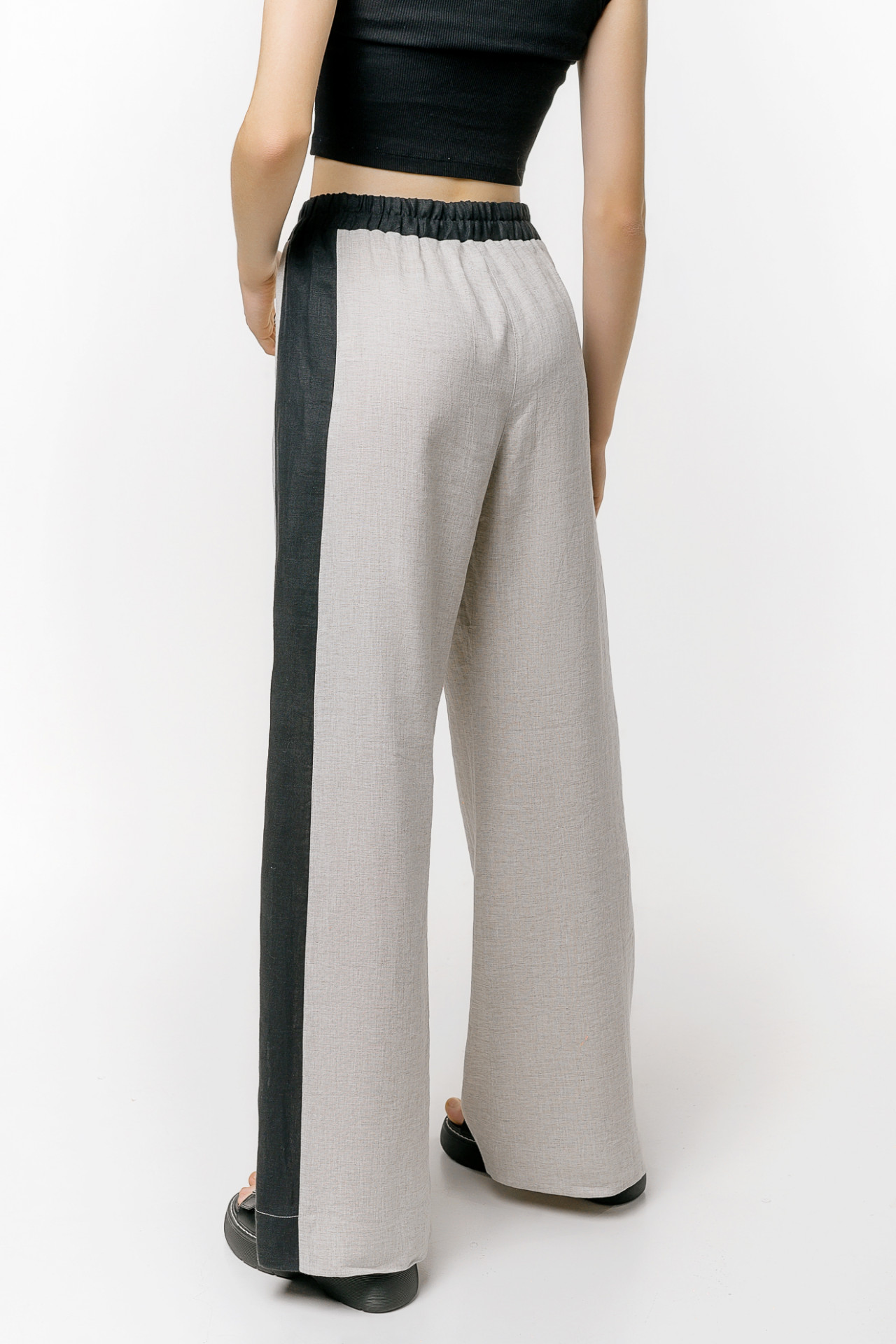 Легкие женские брюки-палаццо. Расширение начинается от линии бедер (самой широкой части). Широкие лампасы черного цвета визуально уменьшает обхват бедер.  Изделие свободного силуэта с поясом на резинке, что обеспечивает универсальную посадку на фигуре любой полноты. Вискоза в составе ткани делает брюки эластичными и струящимися, исходя из этого размеры совмещены.