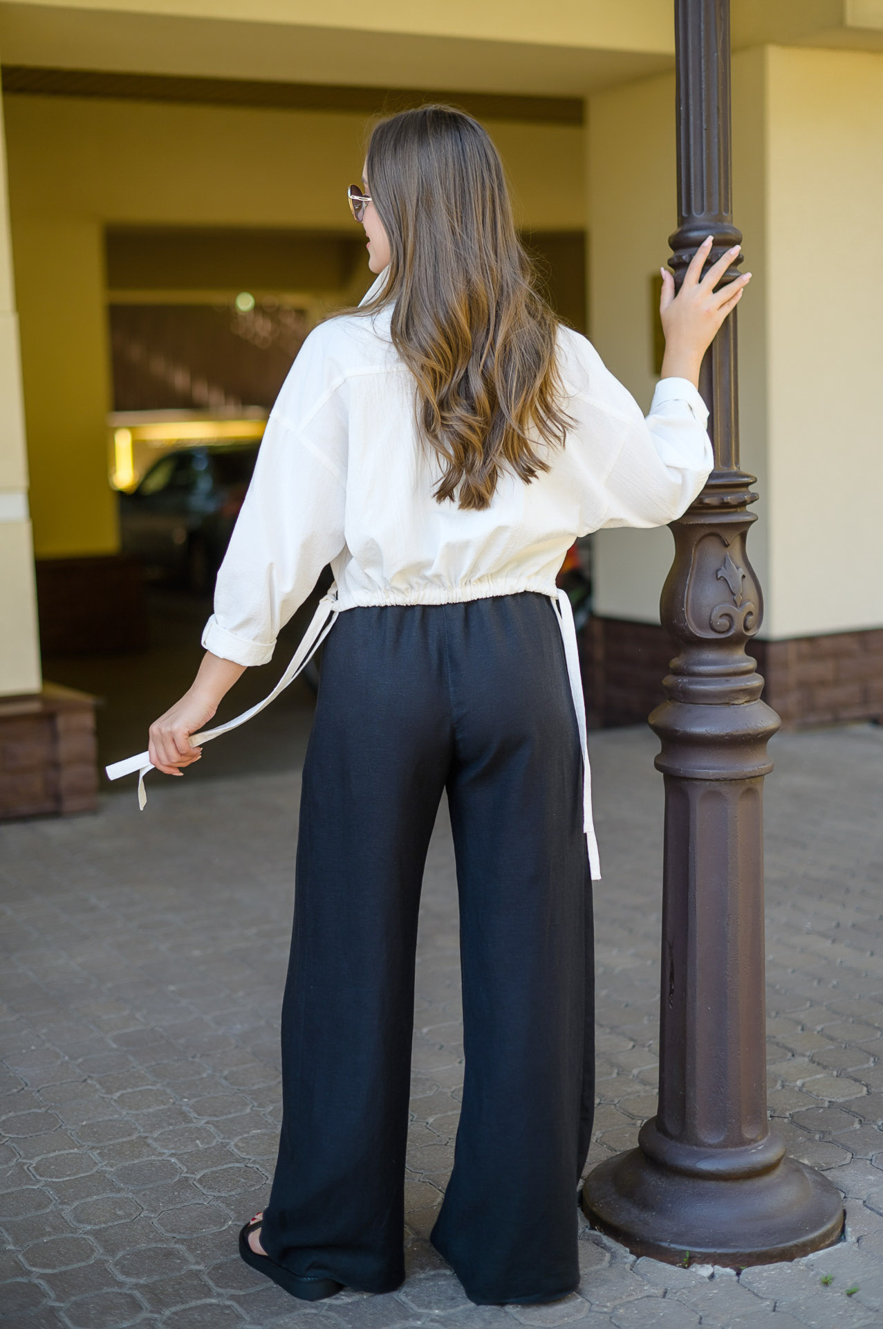 Свободные женские брюки-палаццо из полульняной ткани.  Ткань, состава лен+вискоза, не только отлично «дышит» за счет своей натуральности, но и эффектно драпируется при ходьбе. Пояс на резинке, размеры совмещены. Брюки отлично сочетаются с блузами, топами и жакетами из нашего каталога.
