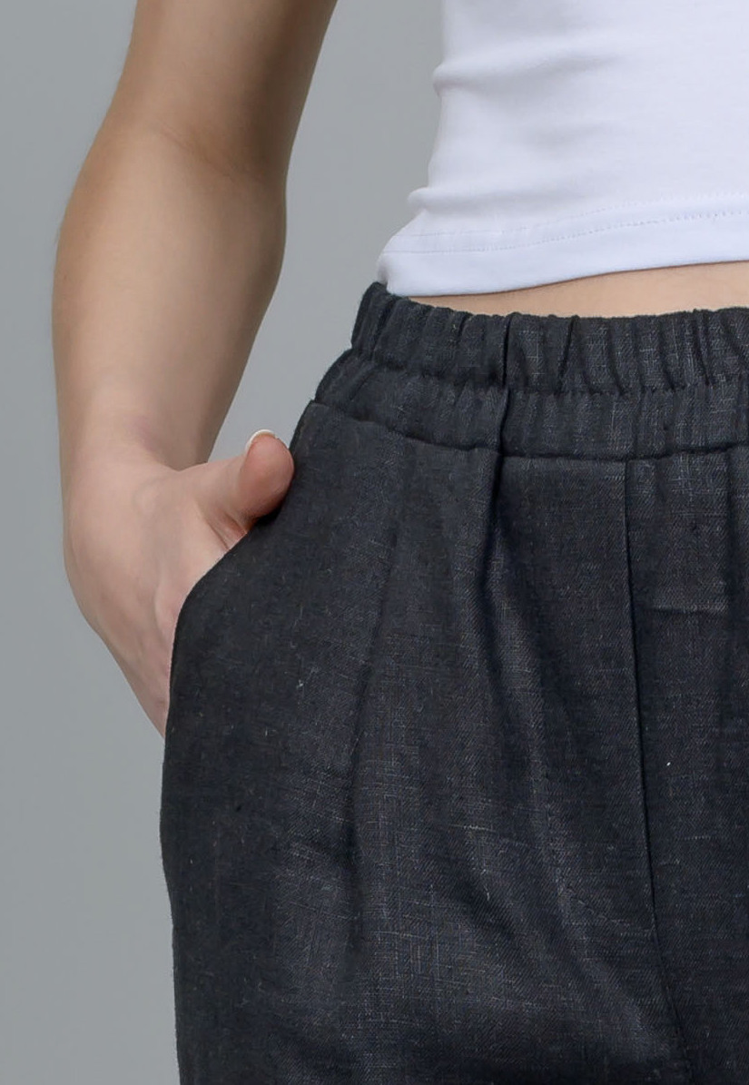 Льняные классические брюки длиной 7/8.  На передних половинках защипы. Пояс на резинке, имеются 2 боковых кармана. Низ изделия оформлен подогнутым манжнтом, который при необходимости можно не фиксировать и этим удлинить брюки.