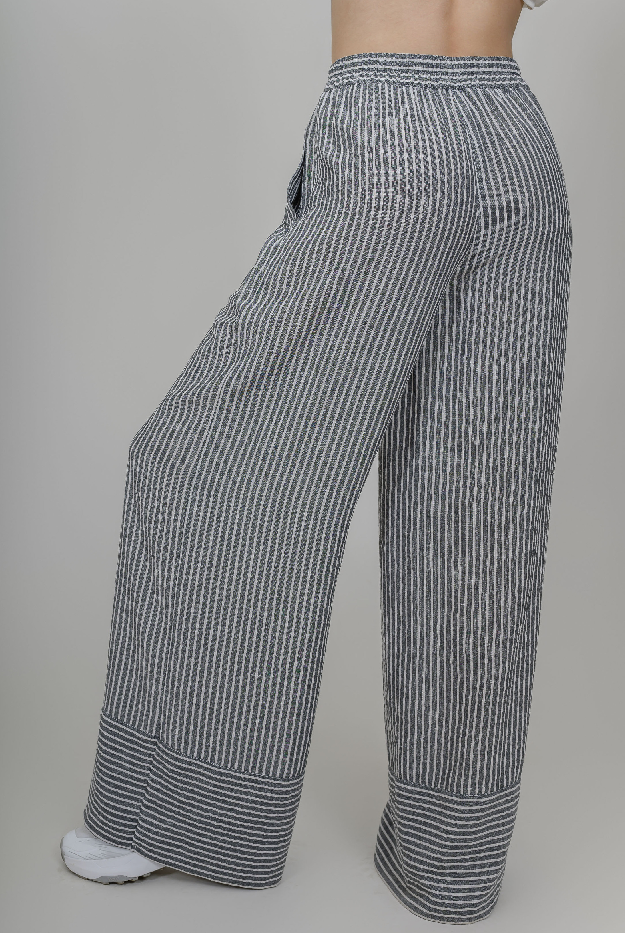Низ брюк отрезной со сменой напраяления полосы.