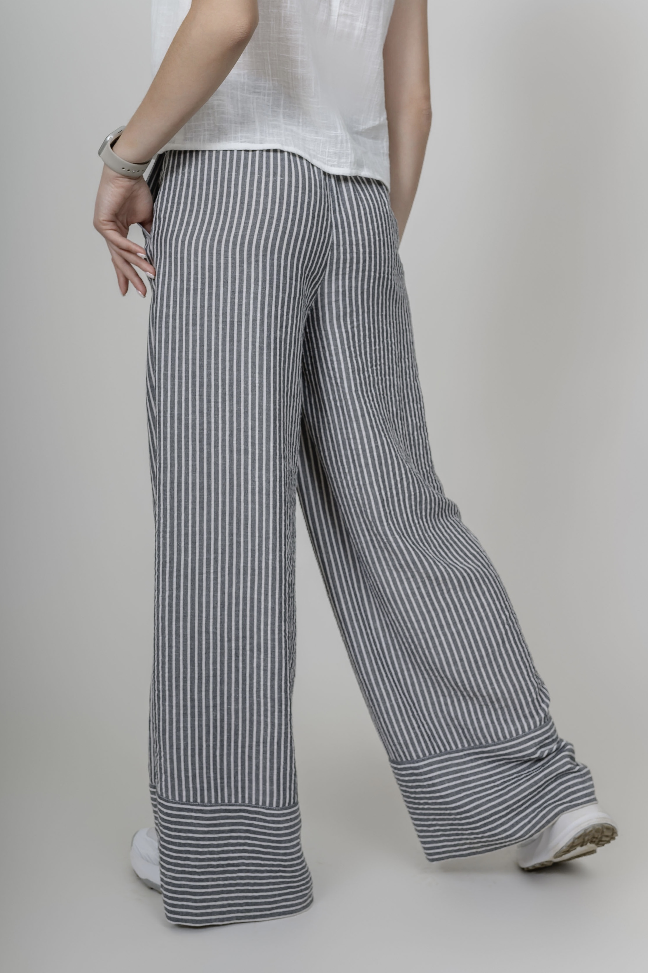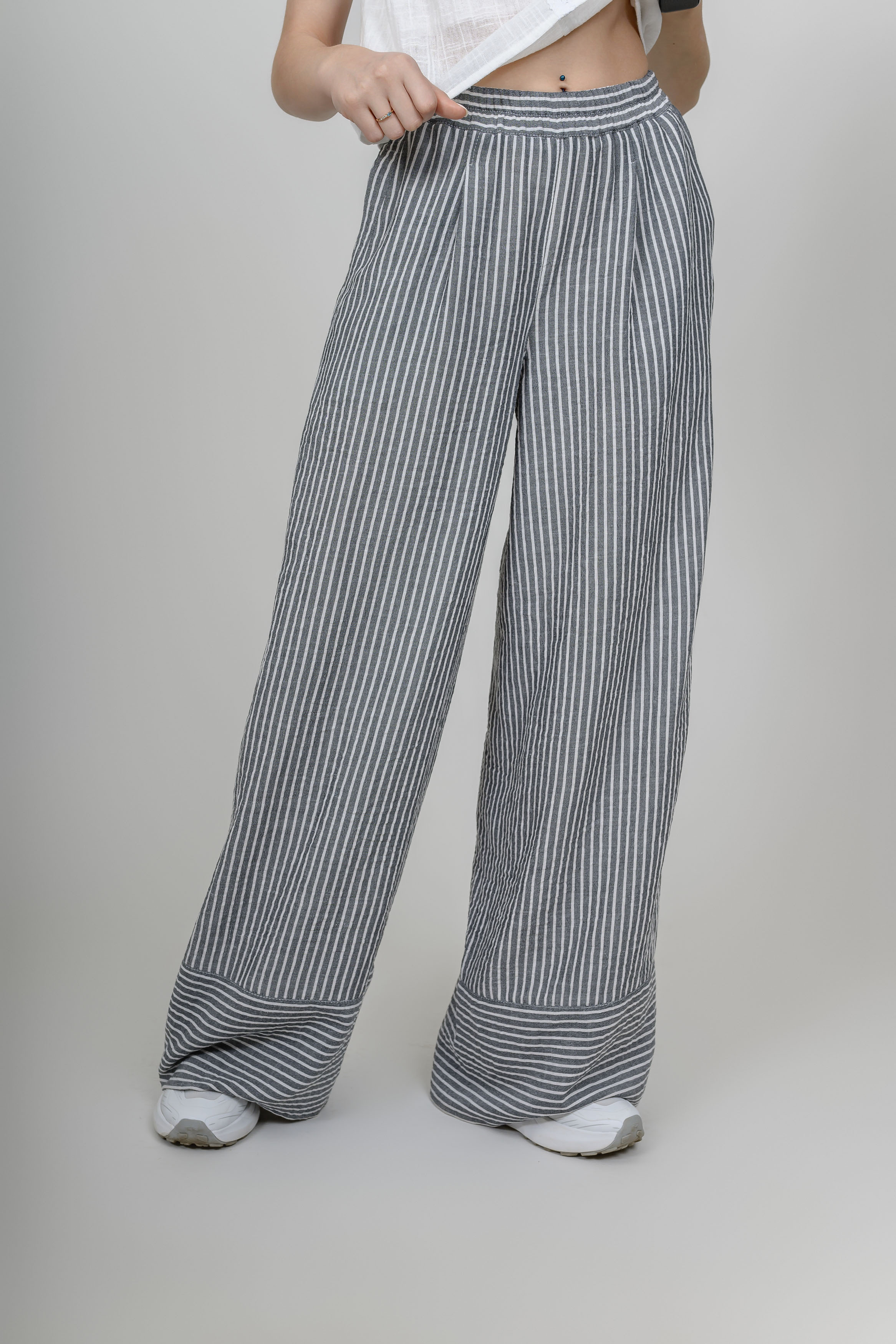 Летние брюки-палаццо из мягкой вискозы с эффектом «крэш». Ткань очень пластична, плавно облегая бедра визуально их сужает за счет вертикальной узкой полоски. Просвечивание исключено. Пояс на резинке. Имеются 2 боковх кармана.