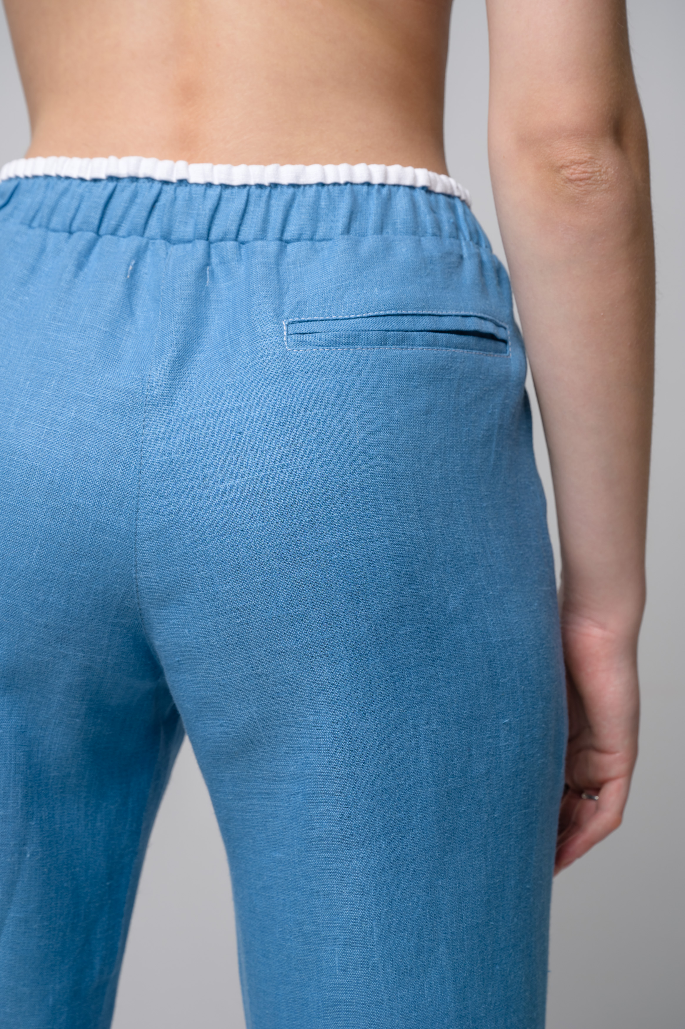 Эти удобные льняные брюки, зауженные к низу, имеют длину 7/8, что делает их универсальными на рост от 156- 174 см. По переду имеются 2 боковых кармана, по задней половинке имитация кармана «в рамку». Широкая резинка плотно и комфортно фиксирует изделие по линии талии.