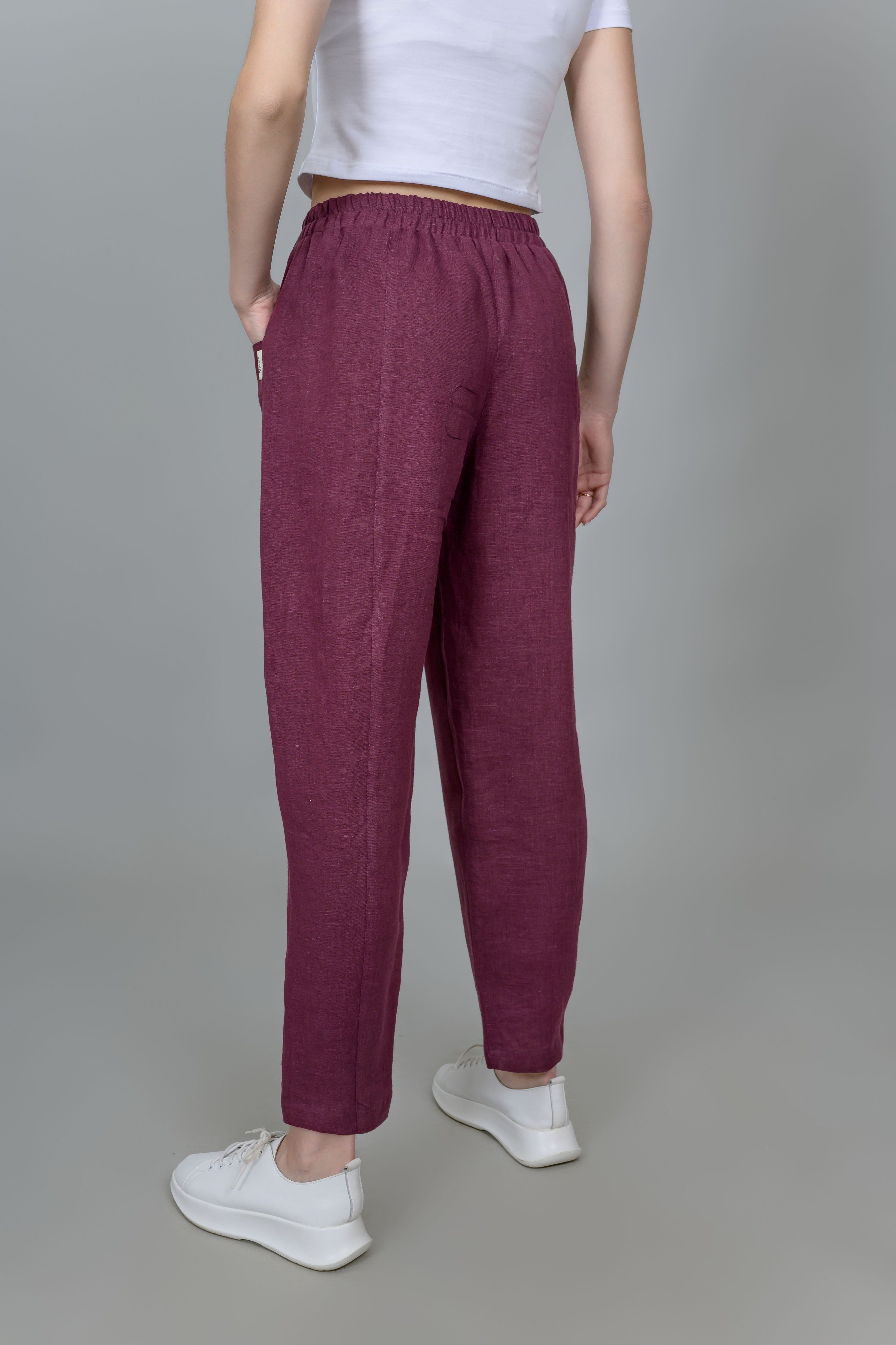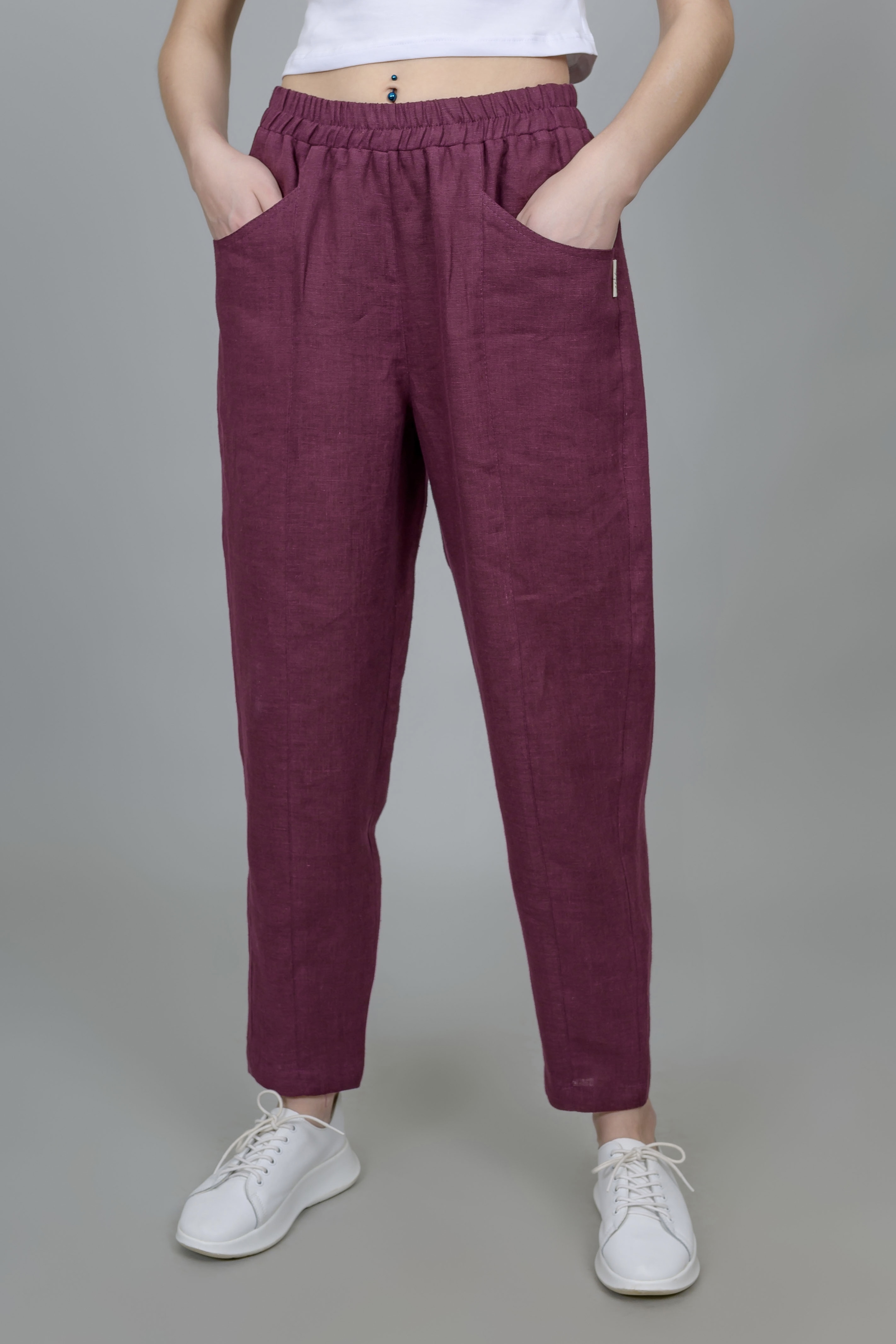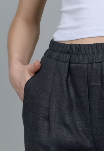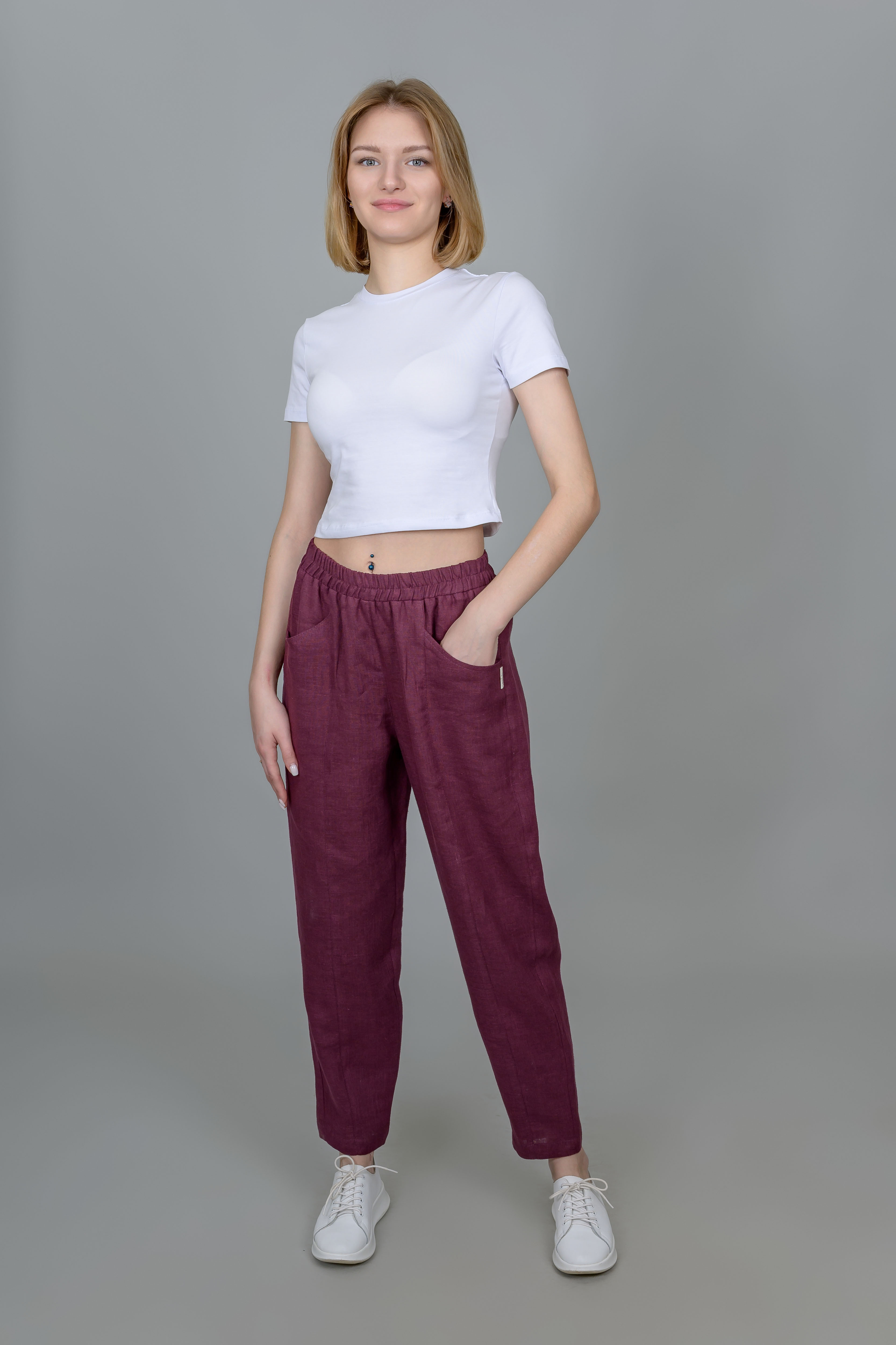 Льняные классические брюки-бананы длиной 7/8.  На передних половинках защипы. Пояс на резинке, имеются 2 боковых кармана.