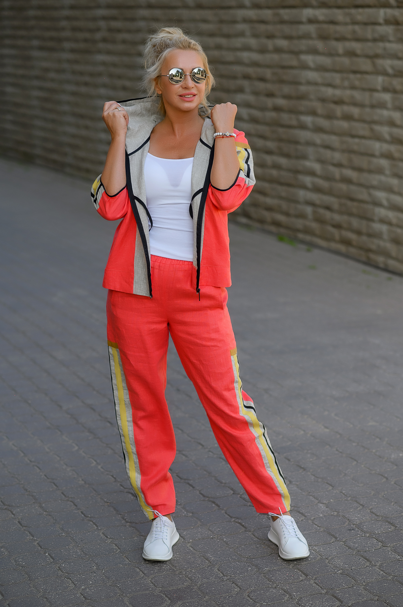 Льняные женские брюки спортивного стиля. Оригинальны в сочетании на контрасте с другими тканями. Имеют 2 боковых кармана. Рекомендованы в комплекте с курткой арт. 059. Размеры совмещены, т.к. костюм имеет стиль «оверсайз».