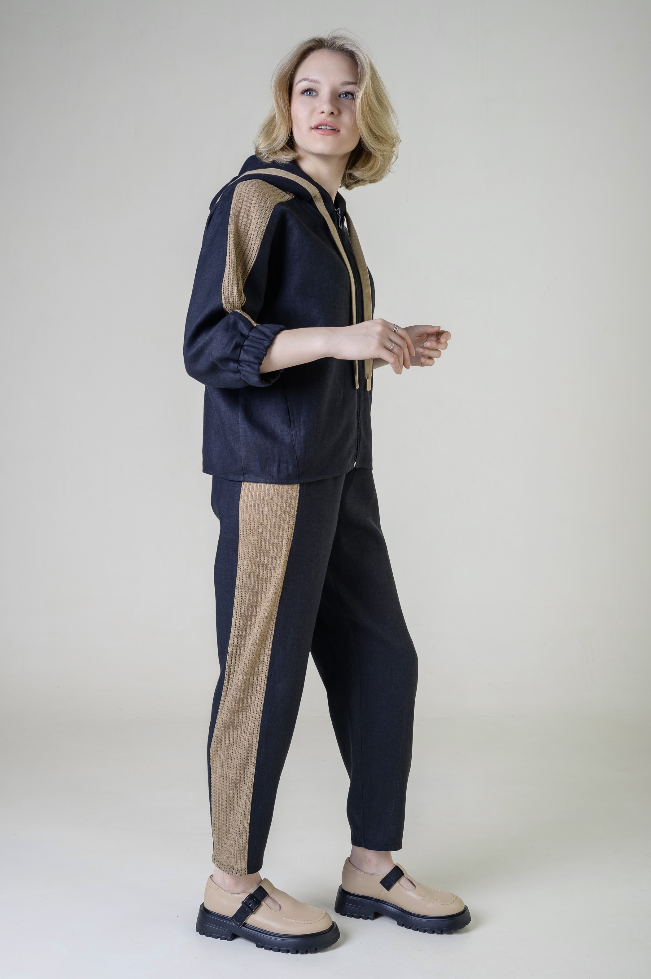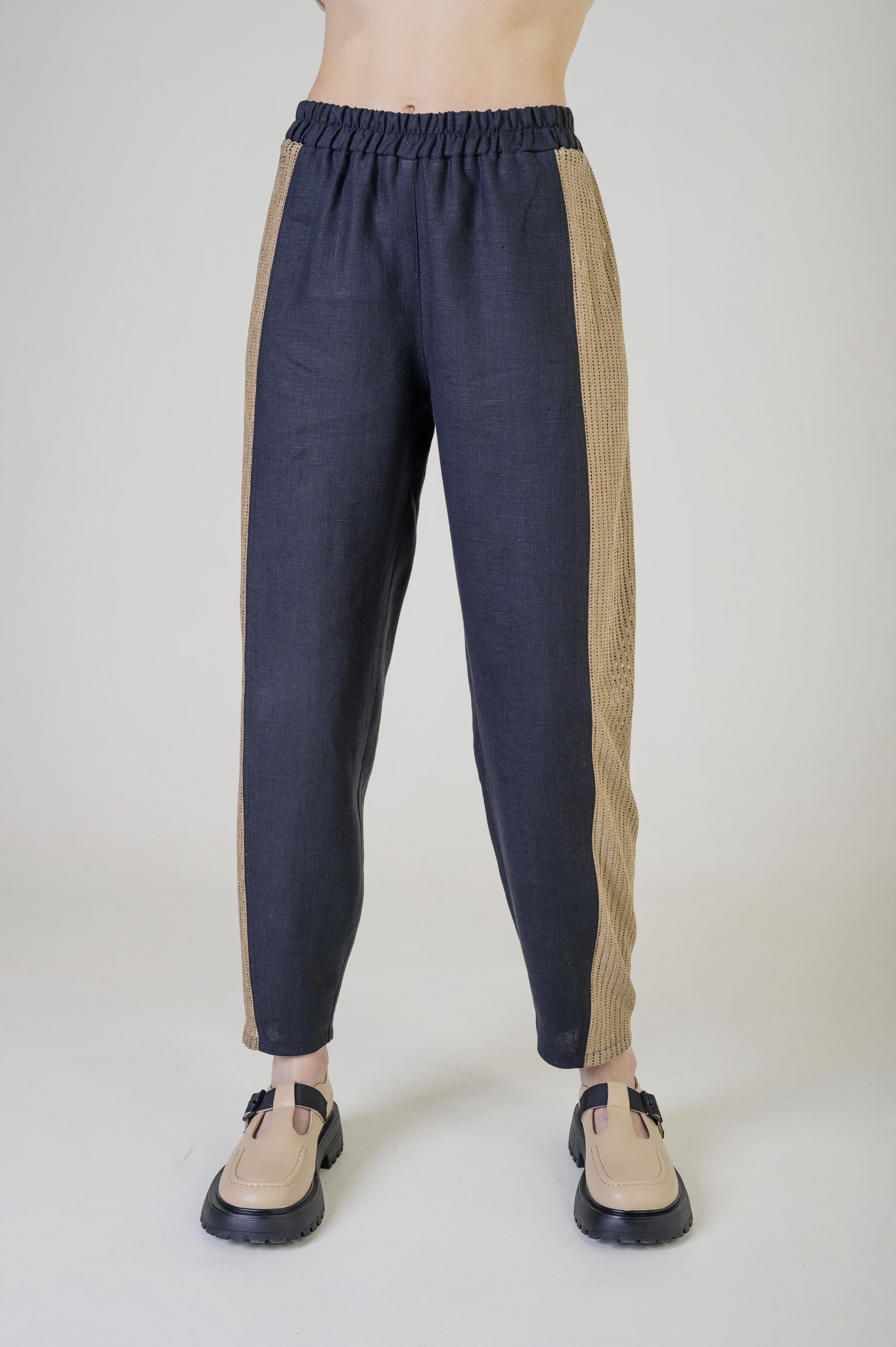 Оригинальные льняные брюки в спортивном стиле. В изделии используется комбинация льняной ткани с ажурным трикотажем. Широкая резинка по поясу обеспечивает комфортную посадку на фигуре и исключает любые другие застежка типа молний, пуговиц, шнурков. В данном изделии используется ткань, мягченая на стадии ее производства. Усадка полностью исключена.