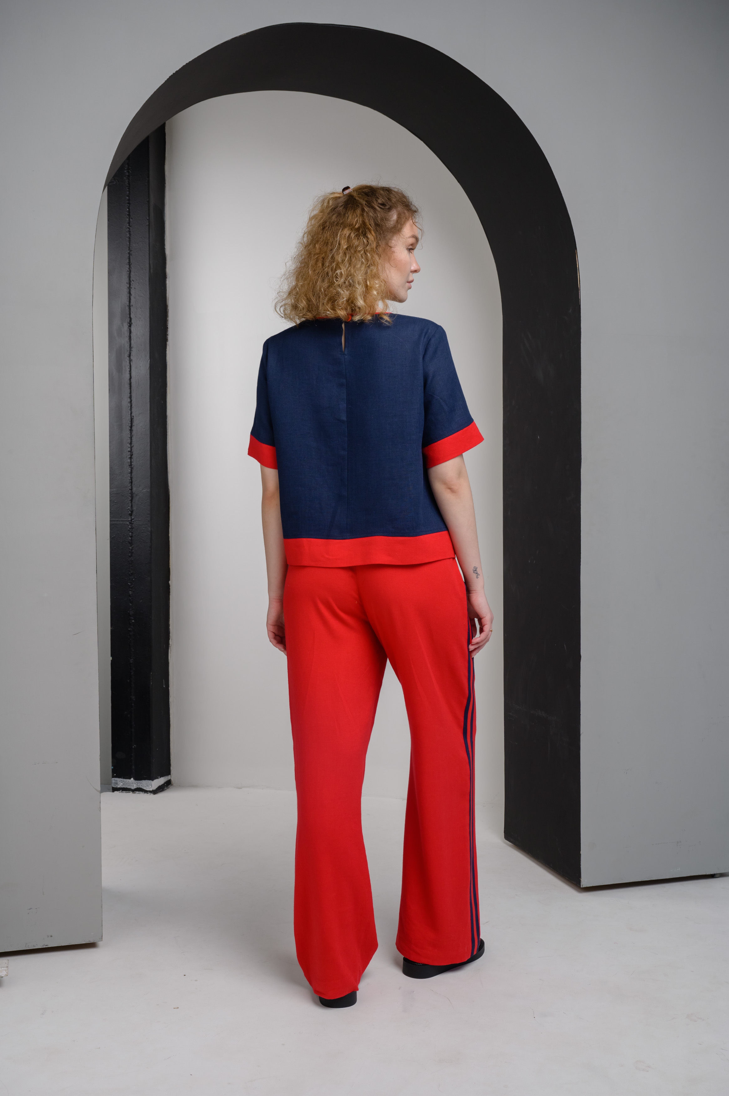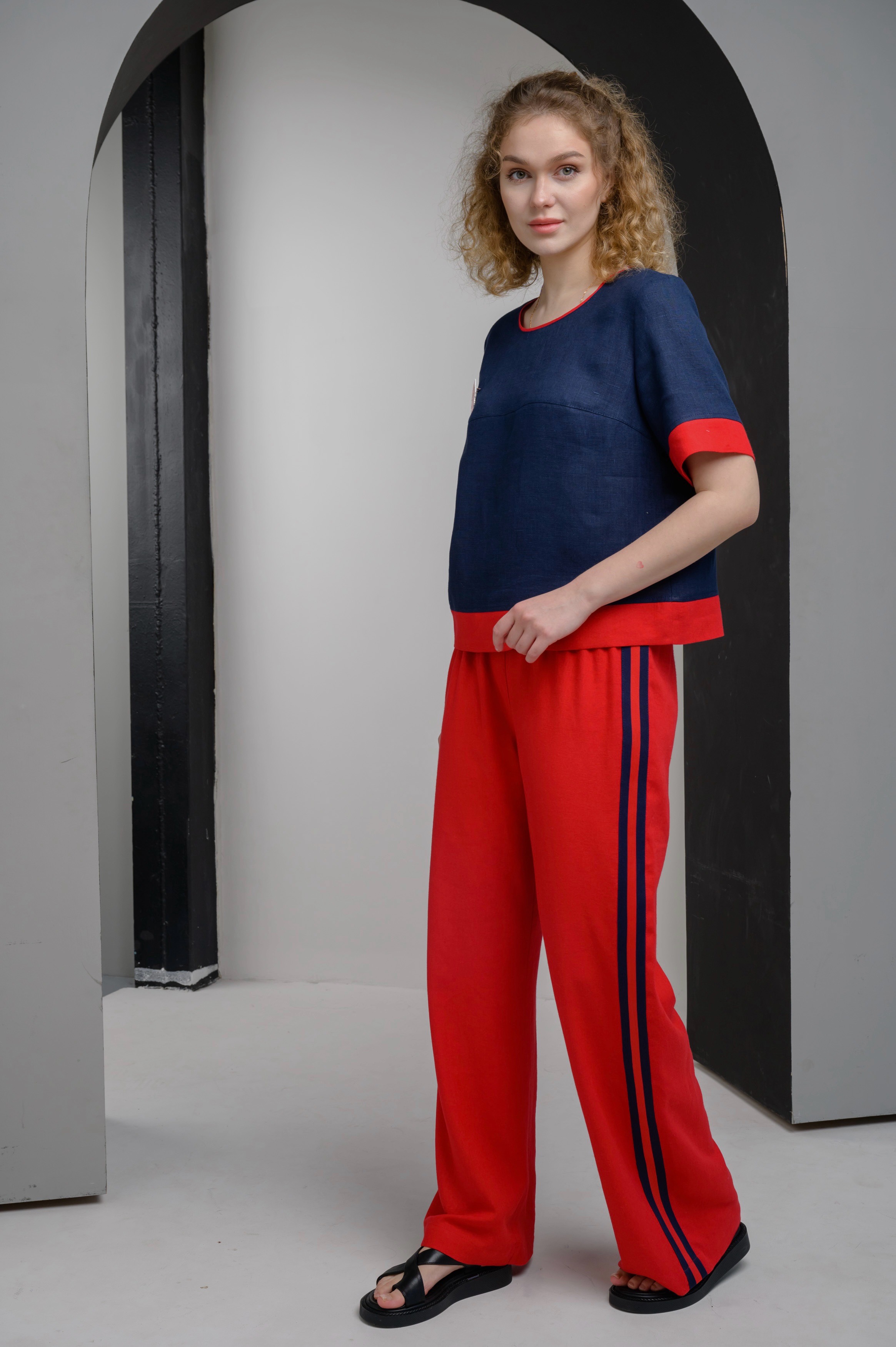 Прямые яркие брюки из полульняной ткани предлагаются как отдельный предмет гардероба, так и в комплекте с блузой арт. 073. Брюки декорированы по бокам лампасной лентой, что говорит о популярном стиле «Спорт-шик», предполагающим уместное использование деталей (лампасы, шнуры и т.д.) в нарядной и повседневной одежде.  Пояс на резинке. Добавление в льняную ткань нитей вискозы придает ей эластичность и мягкость.