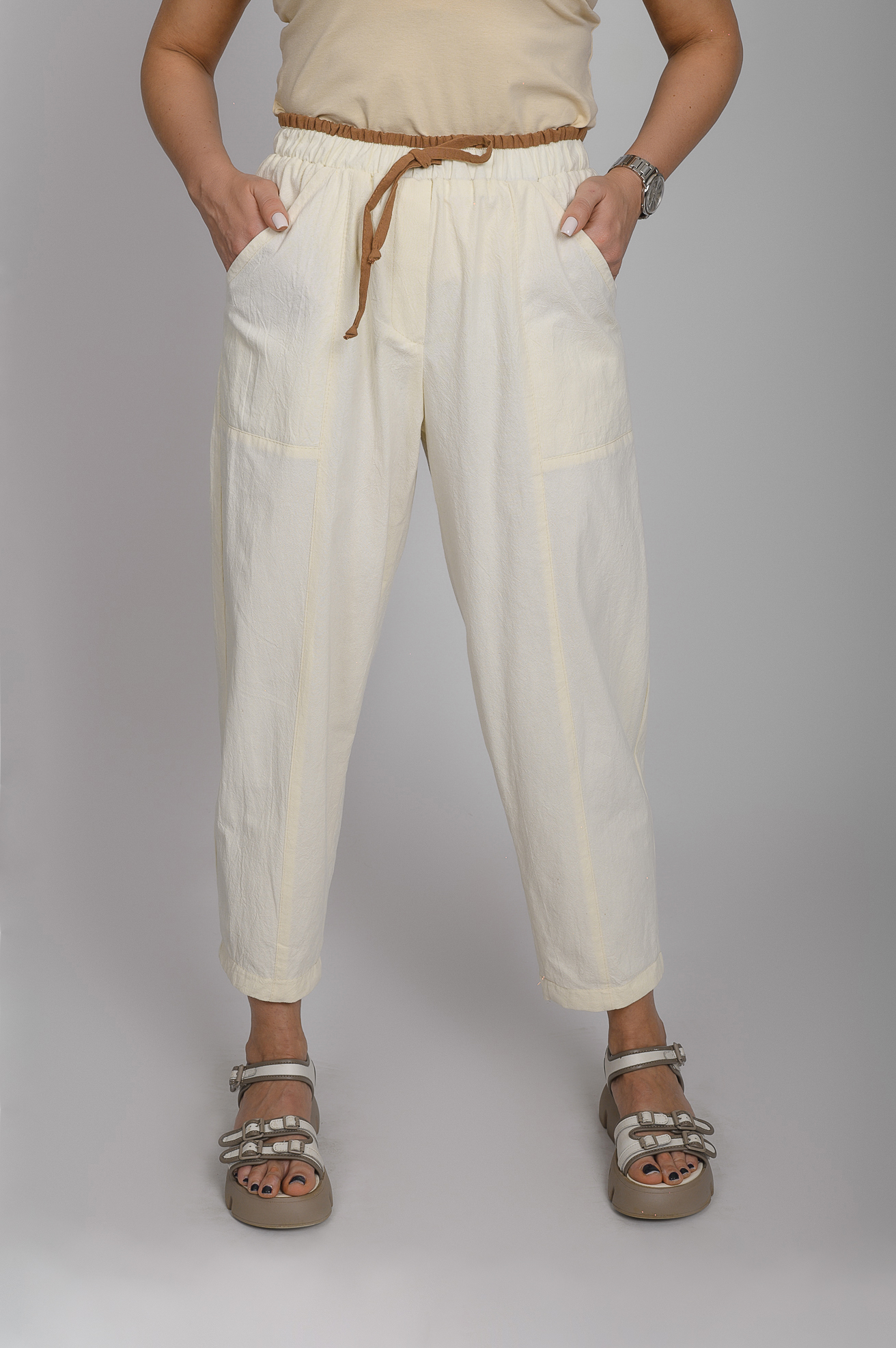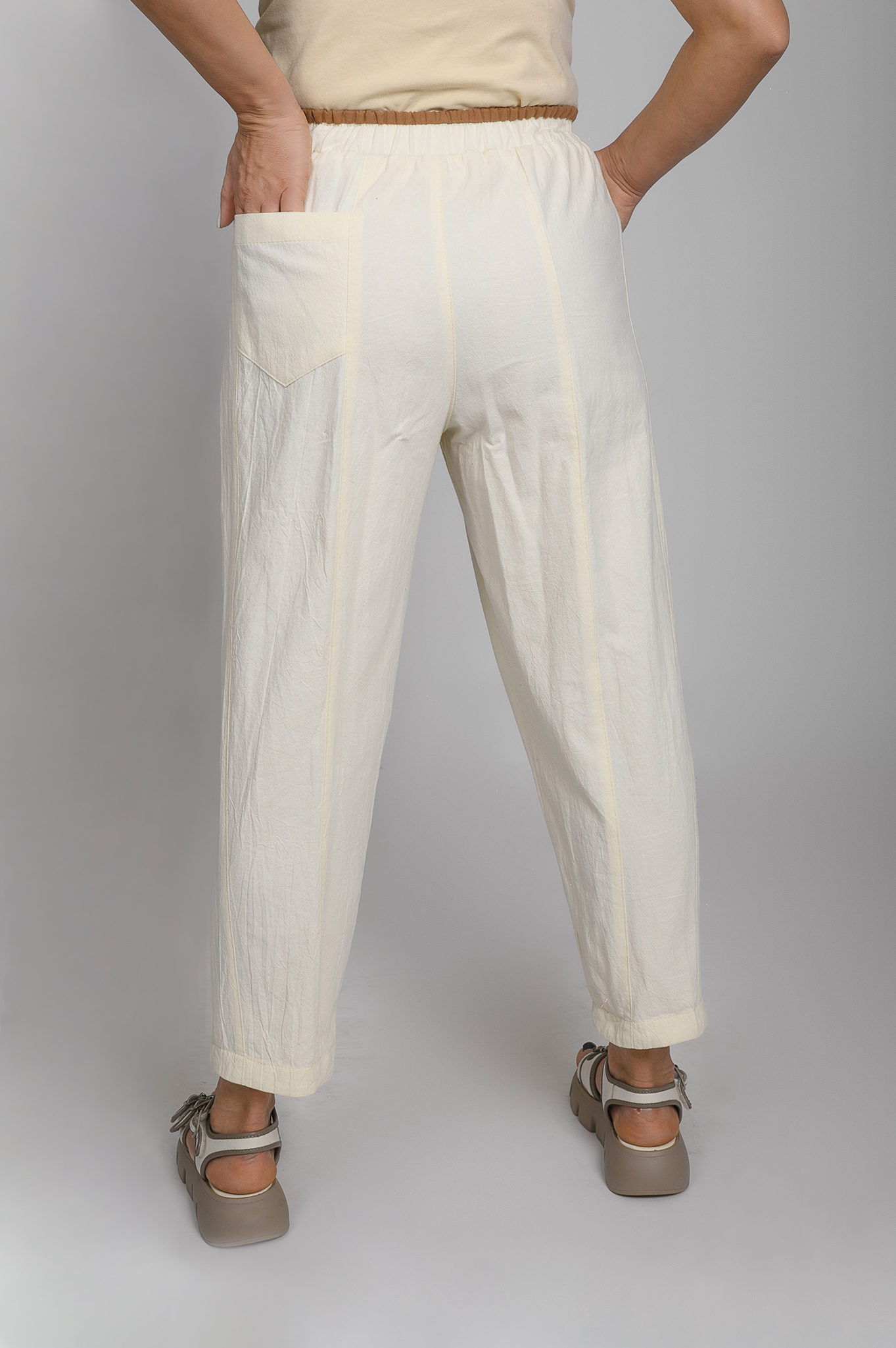 Удобные широкие  летние брюки  слегка зауженные книзу. Верхний срез оформлен поясом с эластичной тесьмой и контрастной отделкой. На передних половинках брюк расположены глубокие карманы с отрезным бочком. Длина по щиколотку.