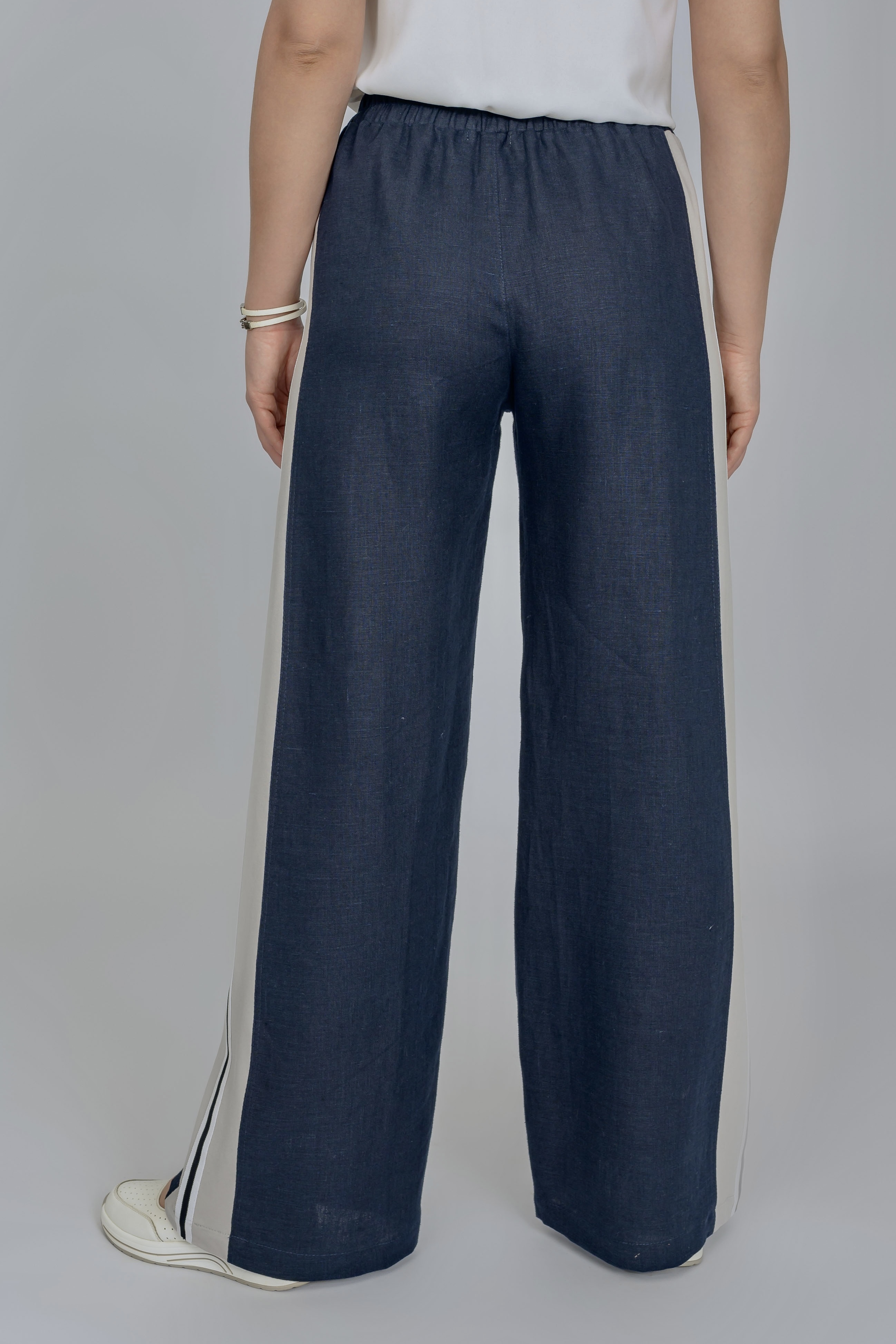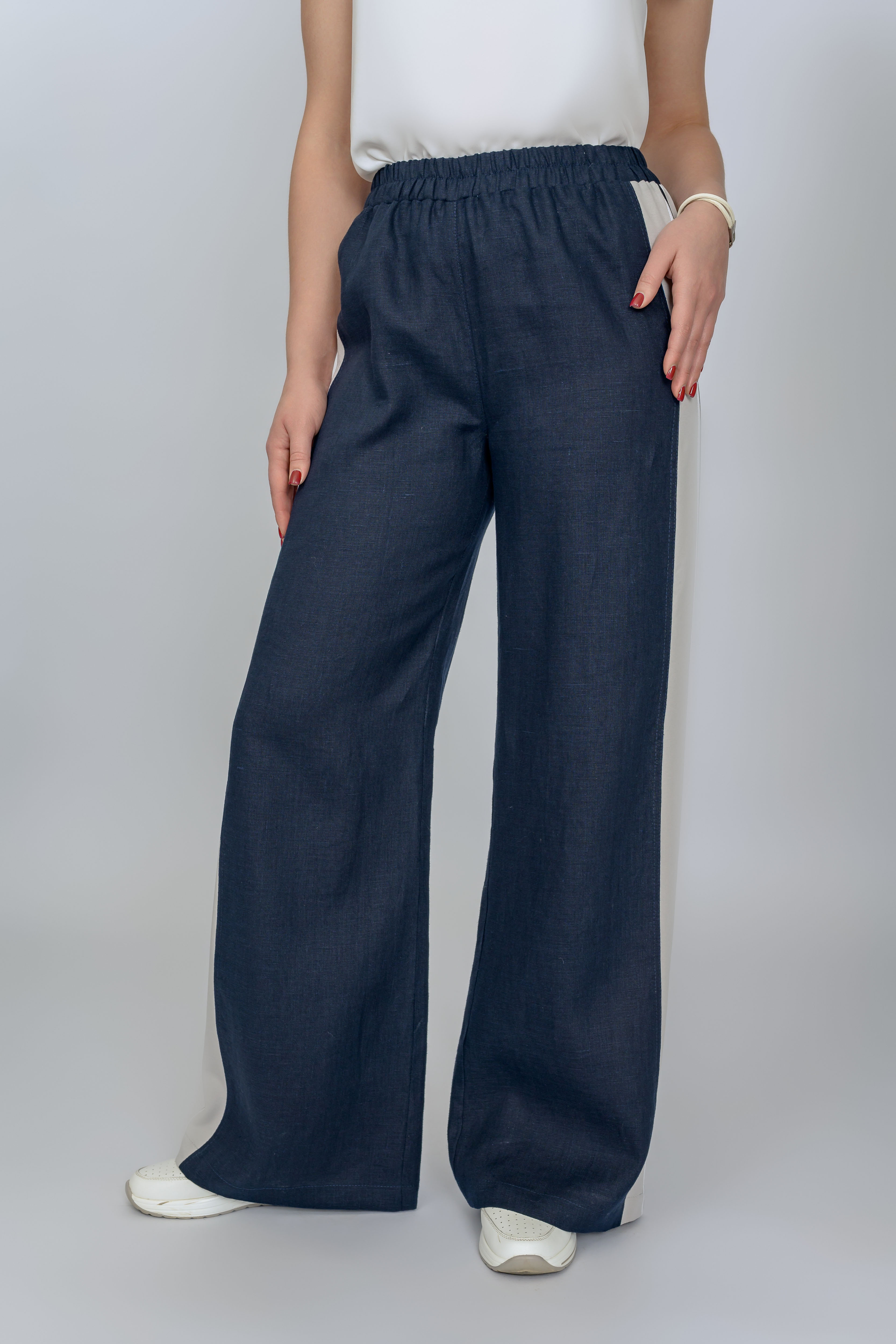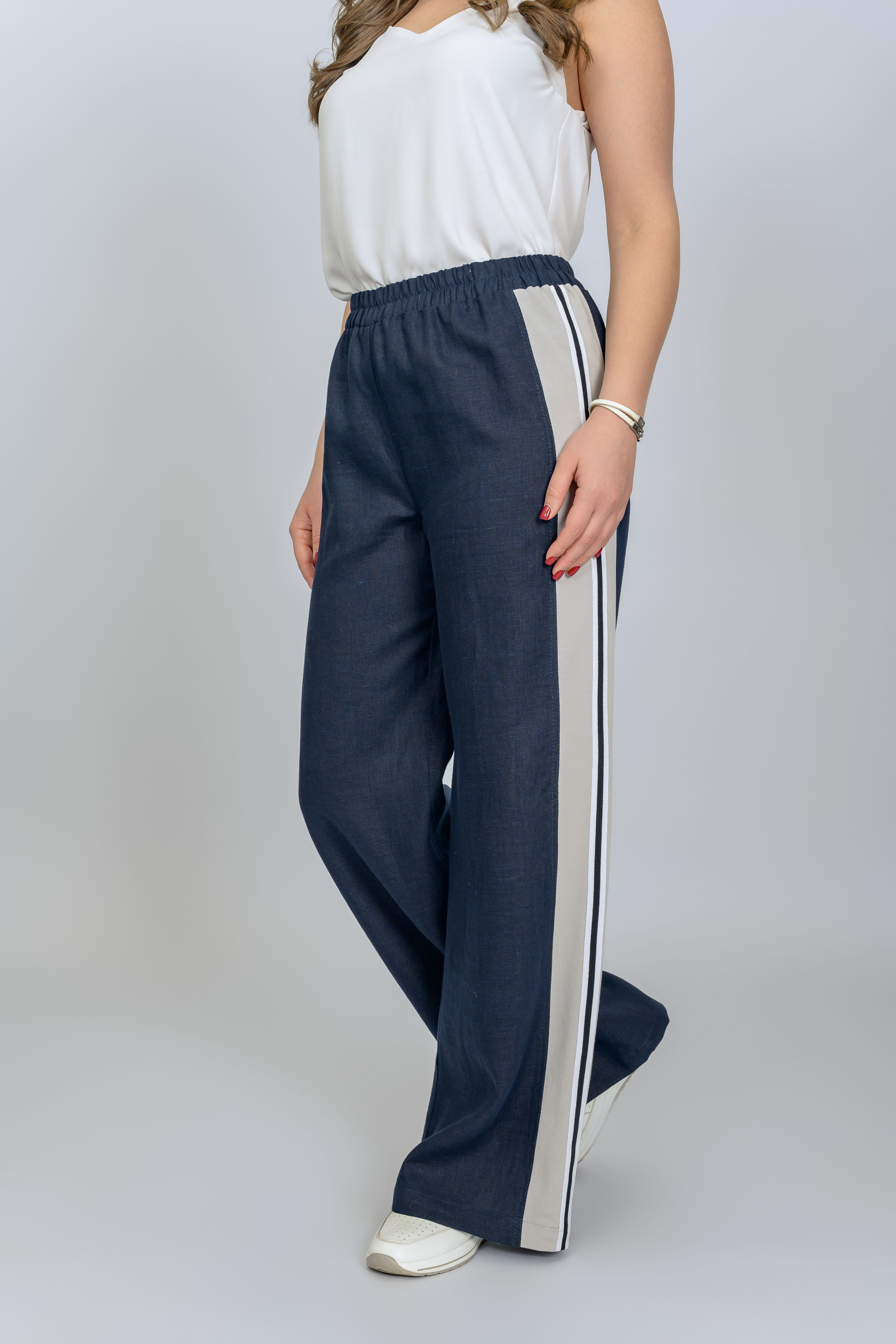 Льняные  свободные брюки в стиле «спорт-шик».  В данном случае мы сочетаем лен с трикотажным полотном. Ширина брюк универсальнаи отлично подходит  для фигур большой полноты. Выигрышным элементом являются светлые трикотажные лампасы, что визуально сужает полноту в области бедер. Просвечивание исключено. Пояс на резинке. Имеются 2 боковх кармана.