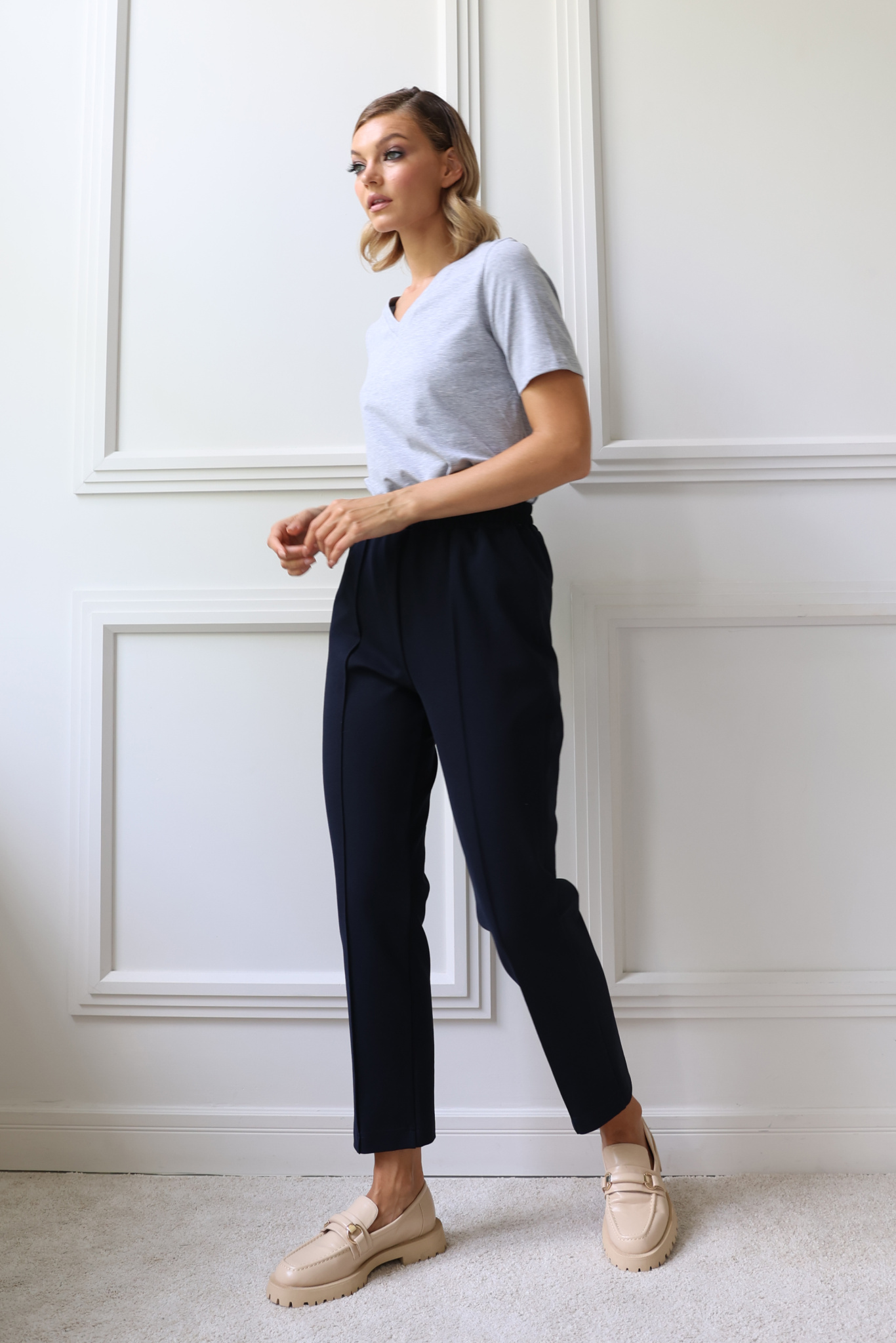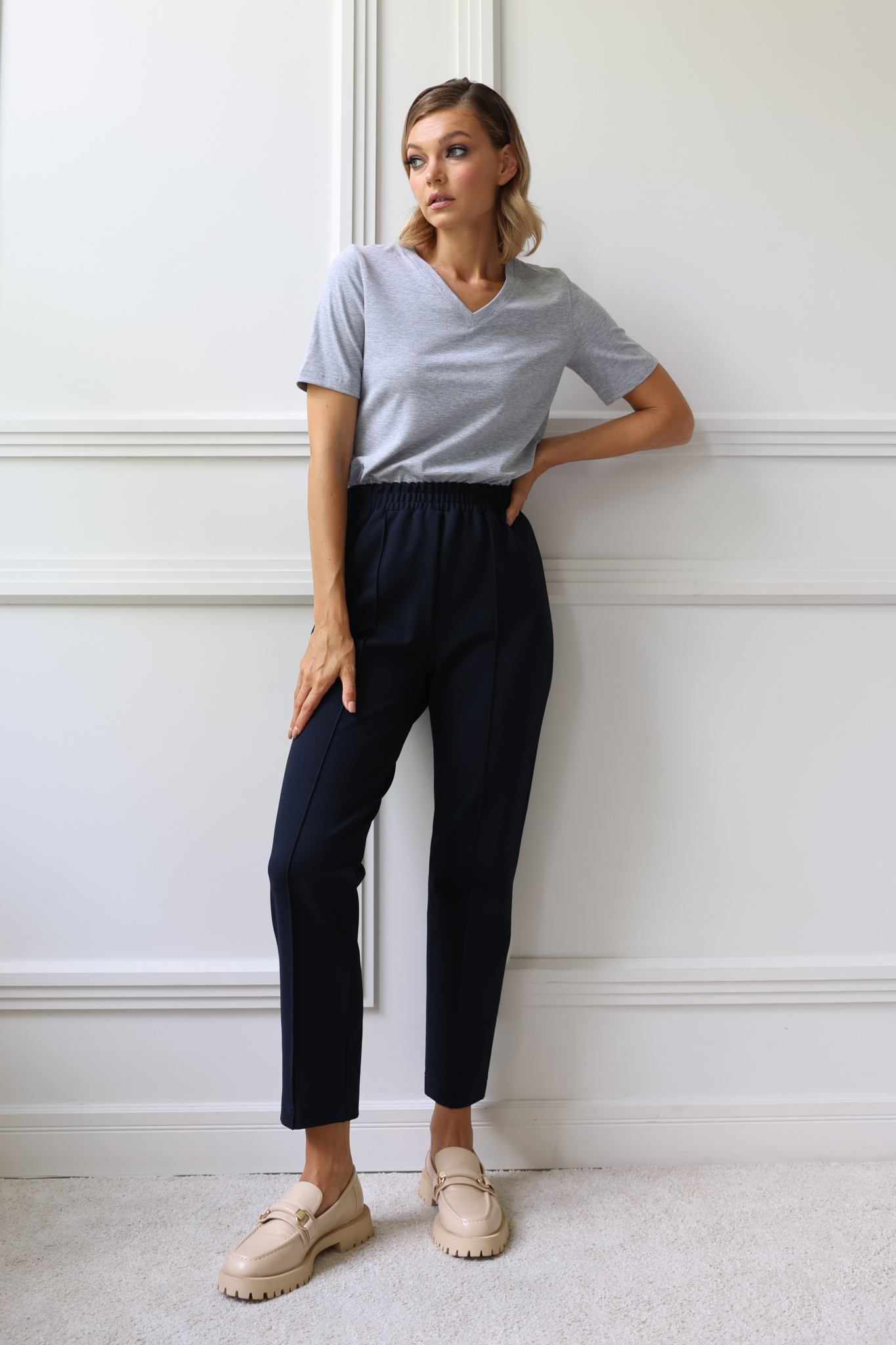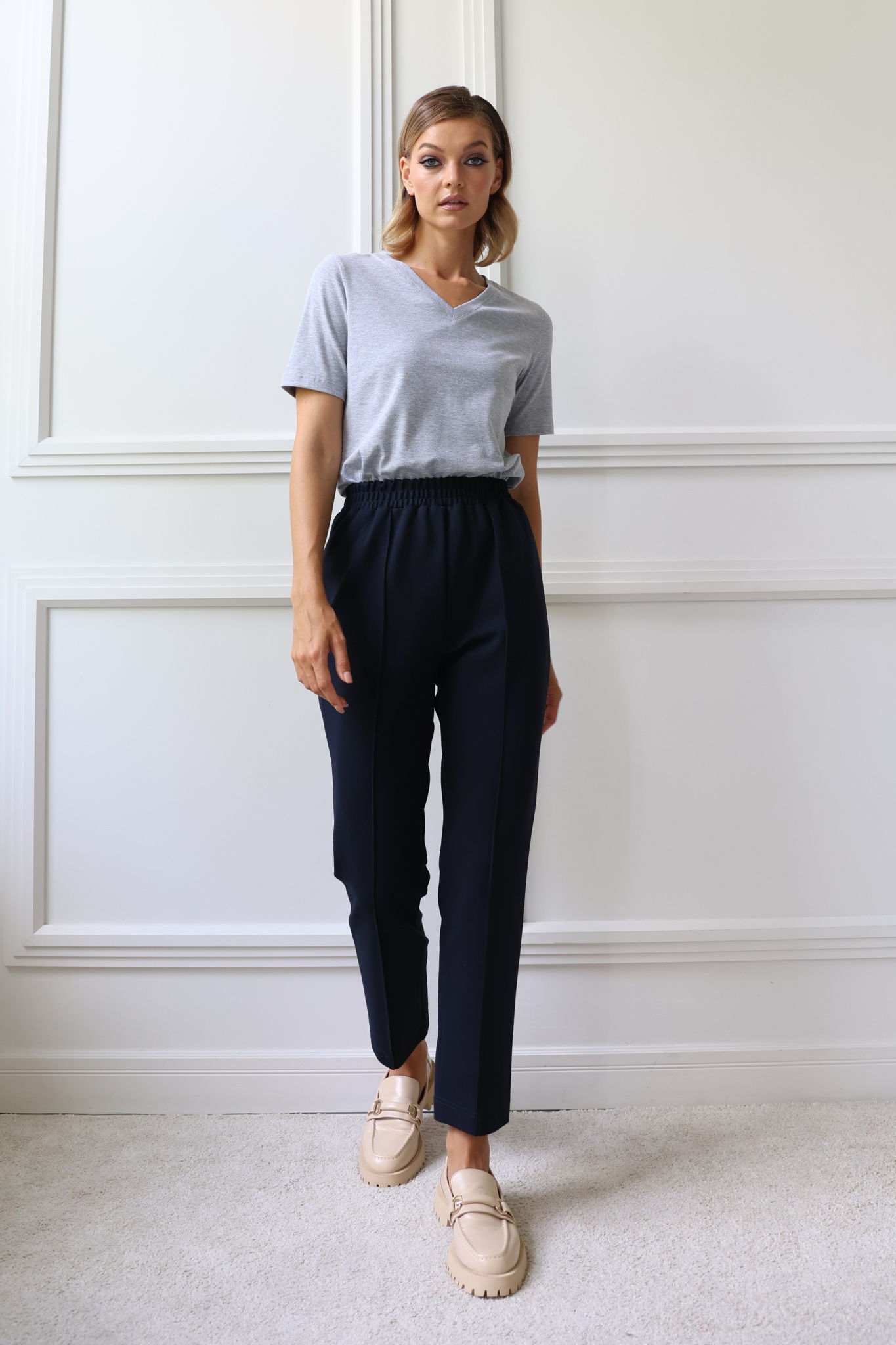 Прямые, укороченные брюки. Пояс на застроченной широкой резинке. Отстроченные стрелки.