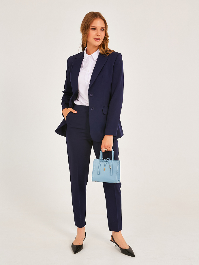 Спереди в подрезных бочках карманы с обтачкой. На подкройном поясе обработан декоративный хлястик, который застёгивается на пуговицу. Шаговый шов заканчивается небольшим разрезом.