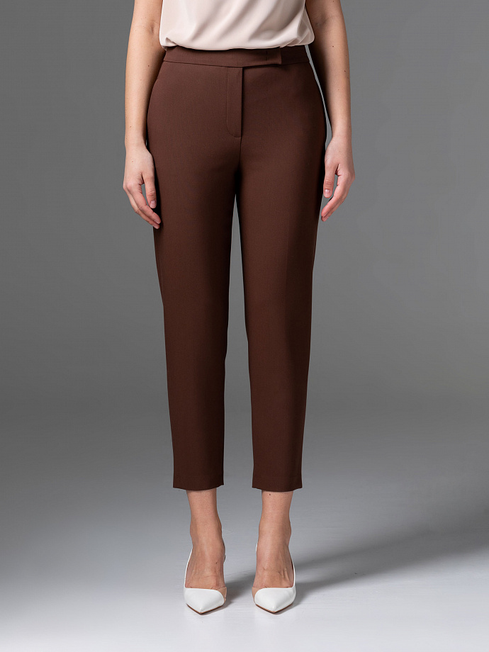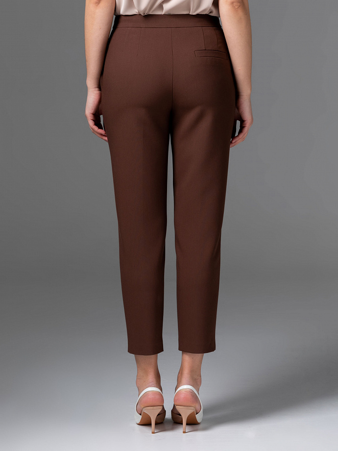 Застёжка на молнию и крючки на поясе. Пояс подкройной. В боковых швах карманы. Сзади имитация прорезного кармана с листочкой.