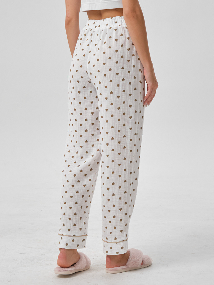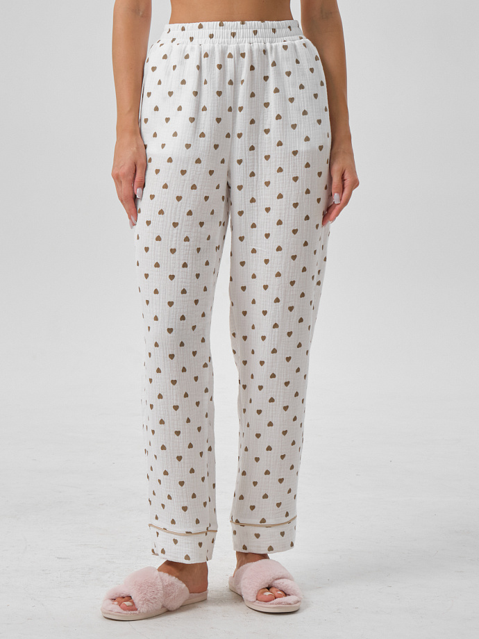 Модель зауженная к низу, на эластичном поясе. В боковых швах карманы. По низу обработаны манжеты. Брюки декорированы контрастным кантом.