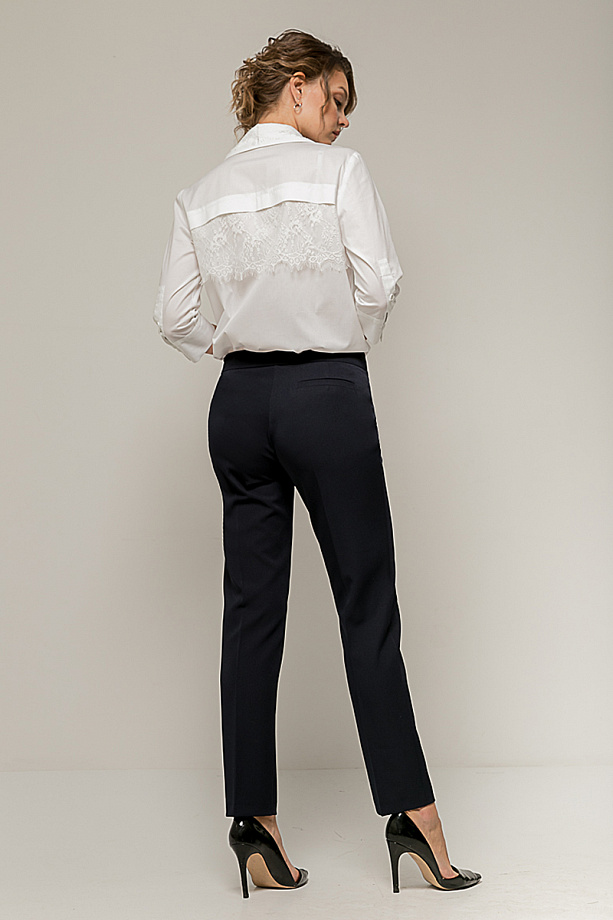 На передней половинке брюк подрезные бочки. На правой задней половинке имитация  кармана с листочкой.