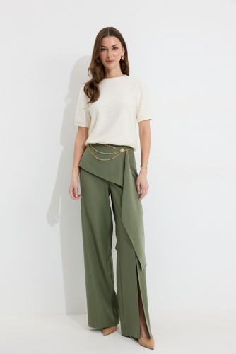 Брюки 4304 (зеленый) 2975 44-54 Брюки прямого силуэта из костюмной ткани. По верху брюк притачной пояс со шлевками для ремня. По переду и спинке декоративная отлетная деталь. На левой передней половинке брюк разрез . В левом боковом шве потайная молния. По задним половинкам брюк на поясе резинка от вытачки до вытачки. Обращаем ваше внимание, что фурнитура может отличаться от фото. !Декоративный пояс в комплект не входит ! Длина брюк (44-48р – 112+4см пояс)(50-54р - 113+4см пояс)