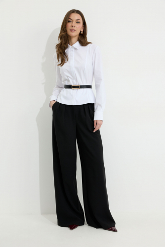 Брюки 4326 (черный) 2720 44-54 Брюки из поливискозной ткани, прямого, расширенного силуэта. На передних половинах брюк по две складки, выходящих из-под пояса, складки застрочены на несколько сантиметров. По переду застежка на молнию по типу гульфик. Брюки по переду с карманами в отрезных бочках. Пояс по переду с застежкой на петлю и пуговицу. Со шлевками по переду и спинке. По спинке в пояс вставлена резинка. На задних половинах брюк вытачки. Обращаем Ваше внимание, что фурнитура может незначительно отличаться от фото. Длина брюк (44-48р 111 см, пояс 4,5 см) (50-54р 112 см, пояс 4,5 см).