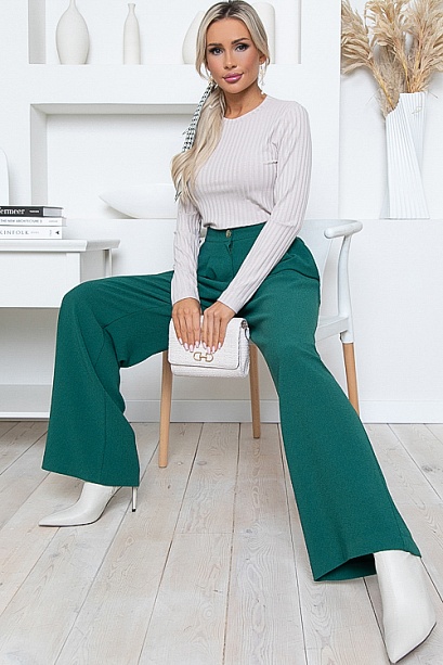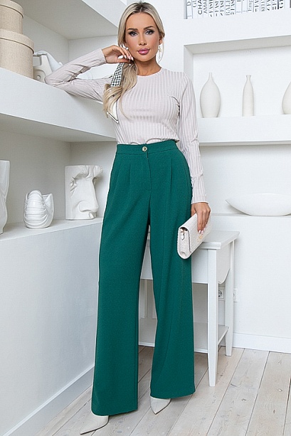 Брюки-палаццо  из комфортной костюмной ткани,с высокой посадкой по талии,застегивающиеся на молнию в гульфике.По переду от пояса застрочены  мягкие складки.В боковых швах функциональные карманы.Пояс притачной,застегивающийся на одну пуговицу,посаженный по спинке на резину.
