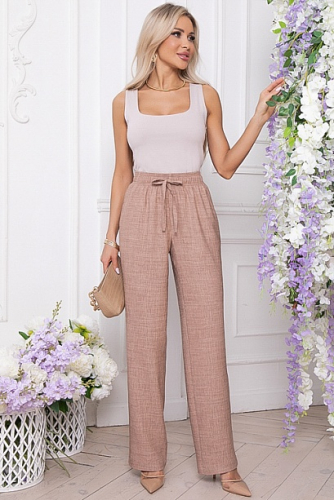 Брюки-юбка из текстильного полотна свободного силуэта с притачным поясом и застежкой молния в боковом шве.